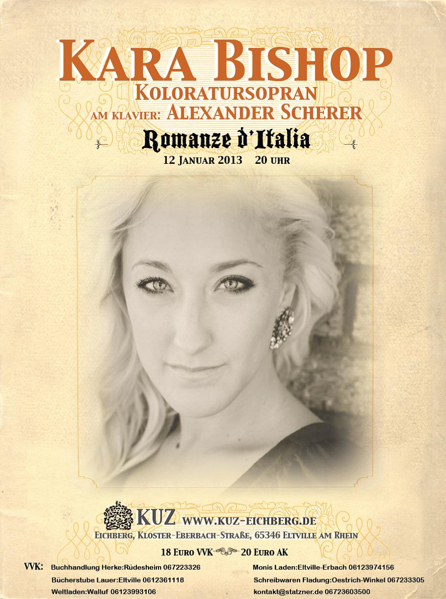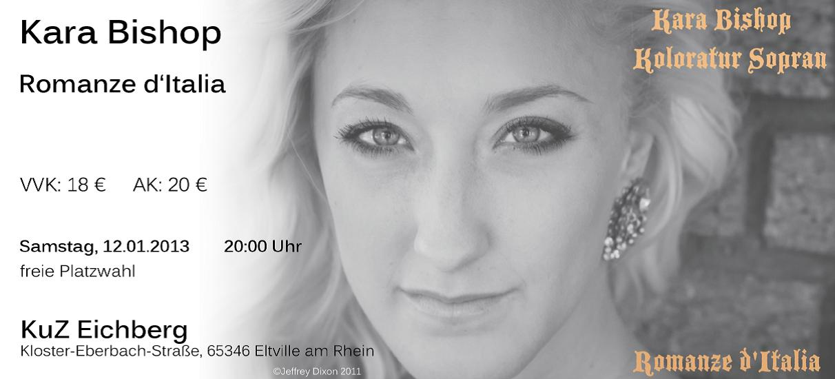 Am 12. Januar 2012 um 20 Uhr wird die 23 Jahre junge Sopransängerin Kara Bishop ihr einzigartiges Europa-Debüt im Kulturzentrum Eichberg präsentieren.
