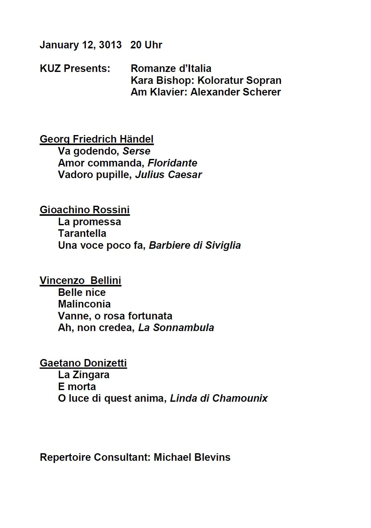 Entdecken Sie selbst am 12. Januar 2013 die verlorene Schönheit dieser Art von Salon-Liederabenden. Frau Bishop präsentiert Lieder und Arien, die thematisch Romanzen: erste Küsse, erste Tänze, erste Lieben und verlorene Lieben beinhalten. Die Melodien haben Charme, idealerweise passend zu der Brillanz und Jugend von Frau Bishops Stimme.