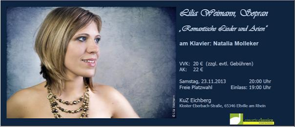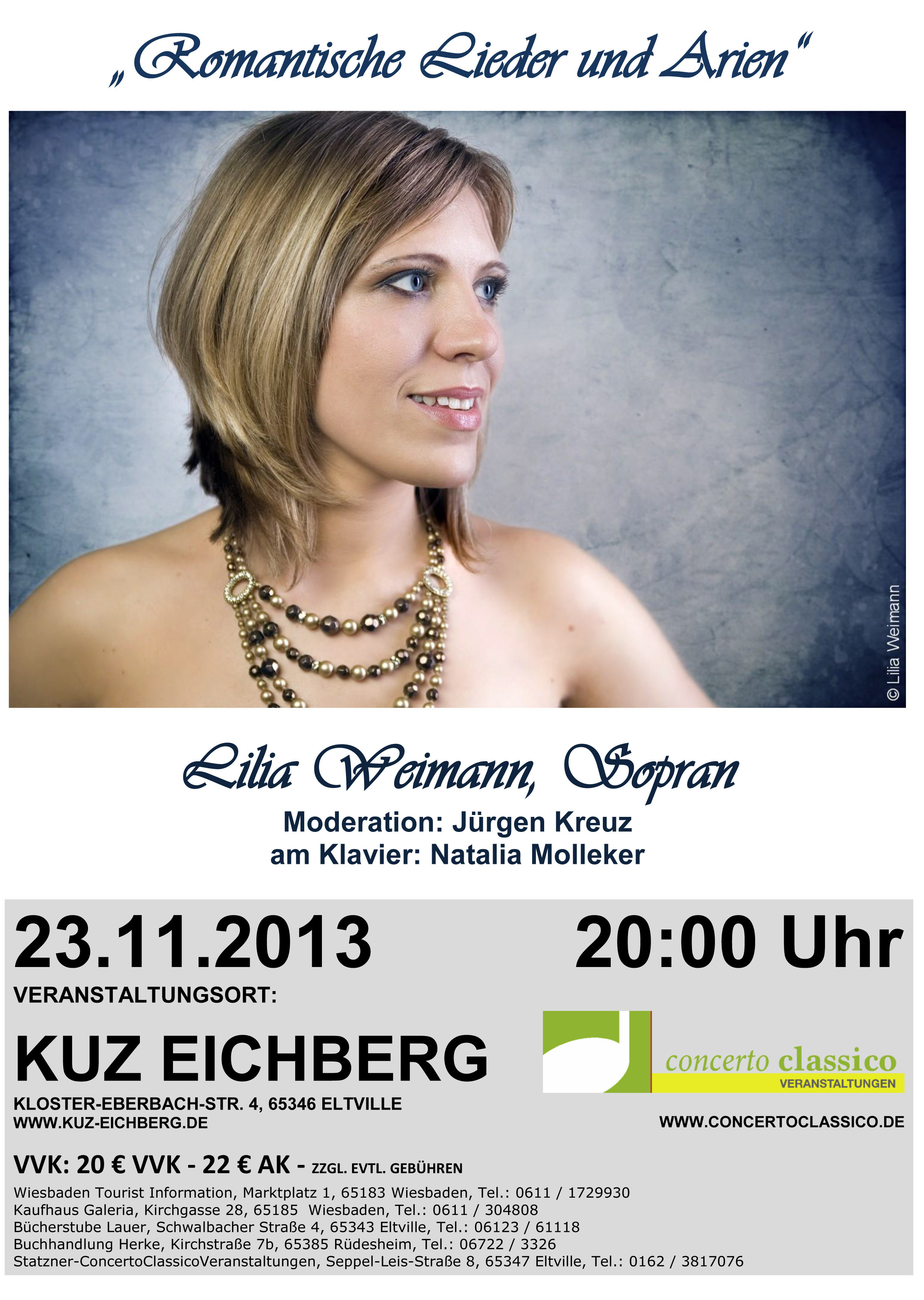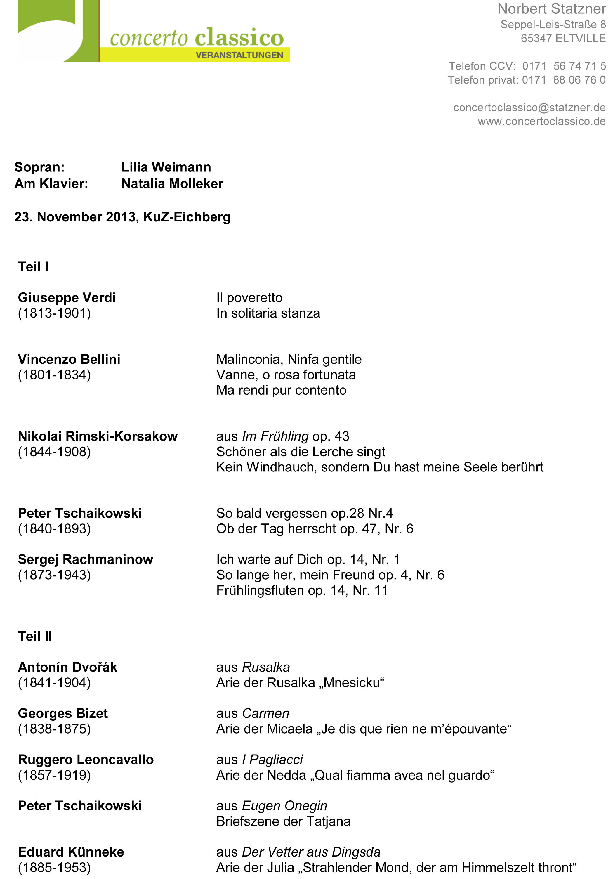 Lilia Weimann präsentiert im ersten Teil ihres Konzertes italienische und russische Lieder von Verdi und Bellini, Rimskiy-Korsakow, Tschaikowski und Rachmaninow. Im zweiten Teil folgen Arien in tschechischer, französischer, italienischer, russischer und deutscher Sprache von namhaften Komponisten wie Dvorák, Bizet, Leoncavallo, Tschaikowski und Künneke.