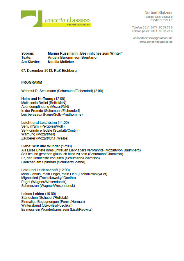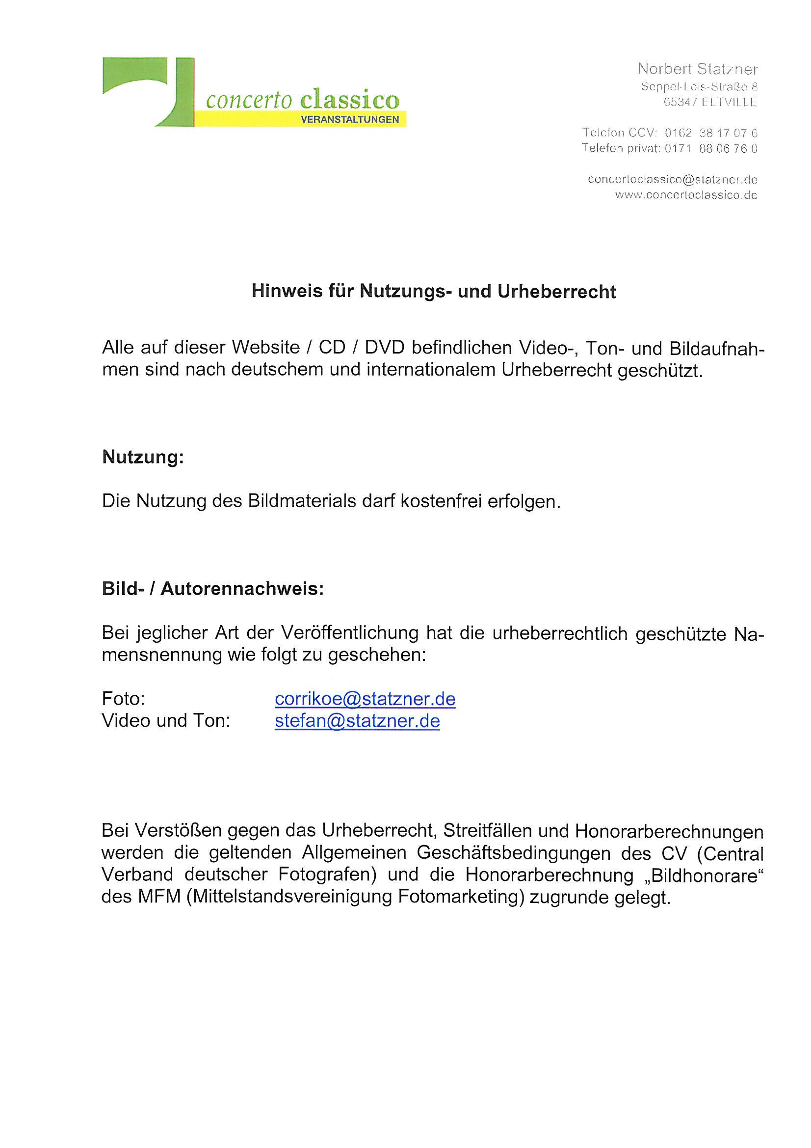 concerto classico Veranstaltungen gUG (haftungsbeschränkt) Norbert Statzner, Seppel-Leis-Straße 8, 65347 Eltville Tel.: (01 71) 5 67 47 15 E-Mail: kontakt@concertoclassico.de |
