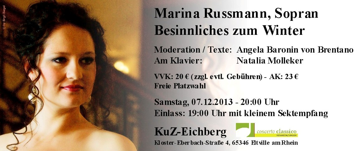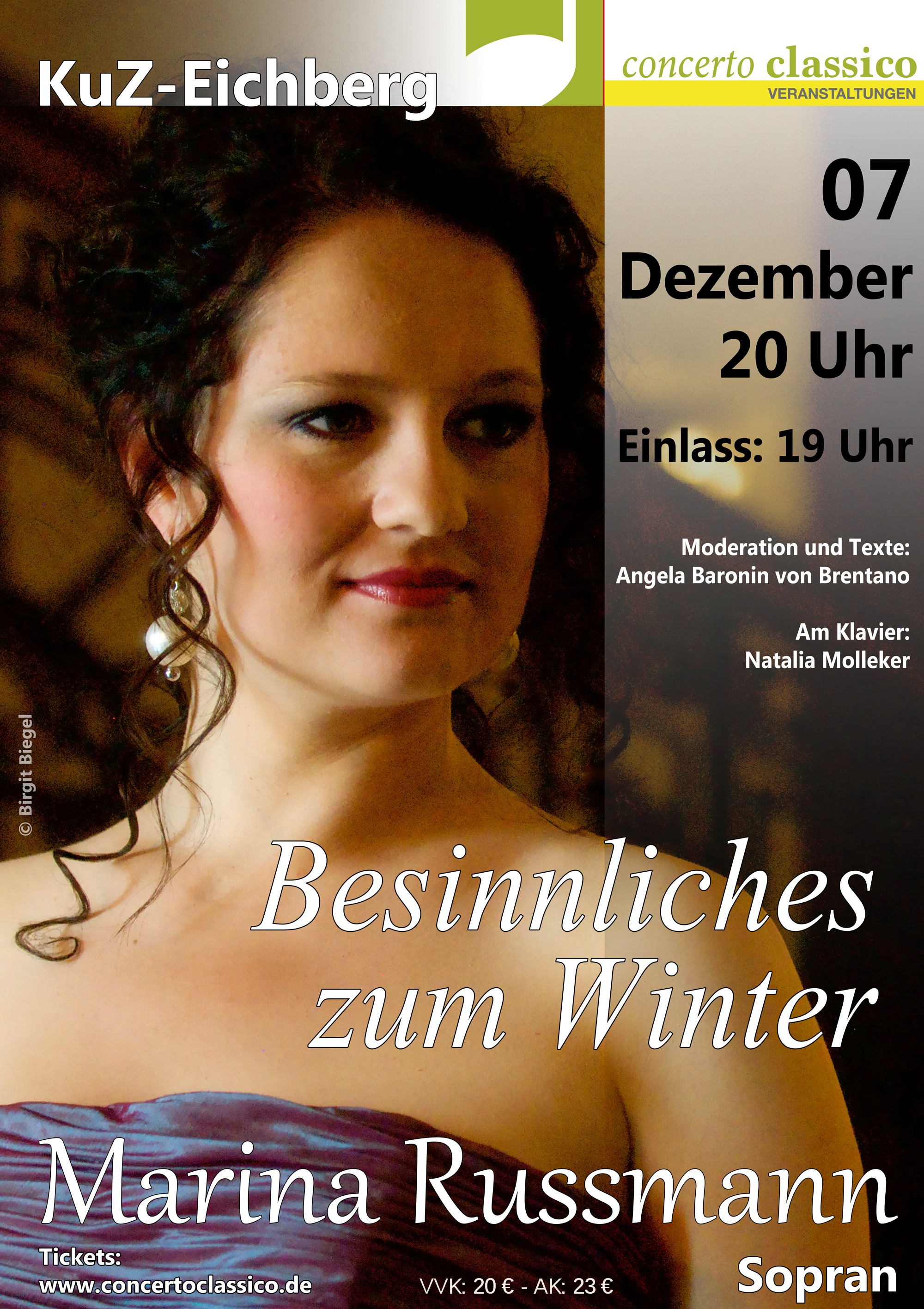 Die Klänge dieses Abends entziehen Sie dem hektischen Weihnachtalltag unserer Konsumgesellschaft. Marina Russmann präsentiert Werke von Scarlatti bis Wagner, die von Herbst und Winter, Abschied und Vergänglichkeit handeln. Genießen Sie die Atmosphäre der winterlichen Melancholie und Träume und lassen Sie ihren Gedanken und Wünschen in der besinnlichen Weihnachtszeit freien Lauf.