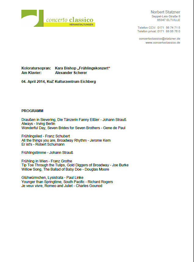 concerto classico Veranstaltungen gUG (haftungsbeschränkt) Norbert Statzner, Seppel-Leis-Straße 8, 65347 Eltville Tel.: (01 71) 5 67 47 15 E-Mail: kontakt@concertoclassico.de |