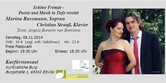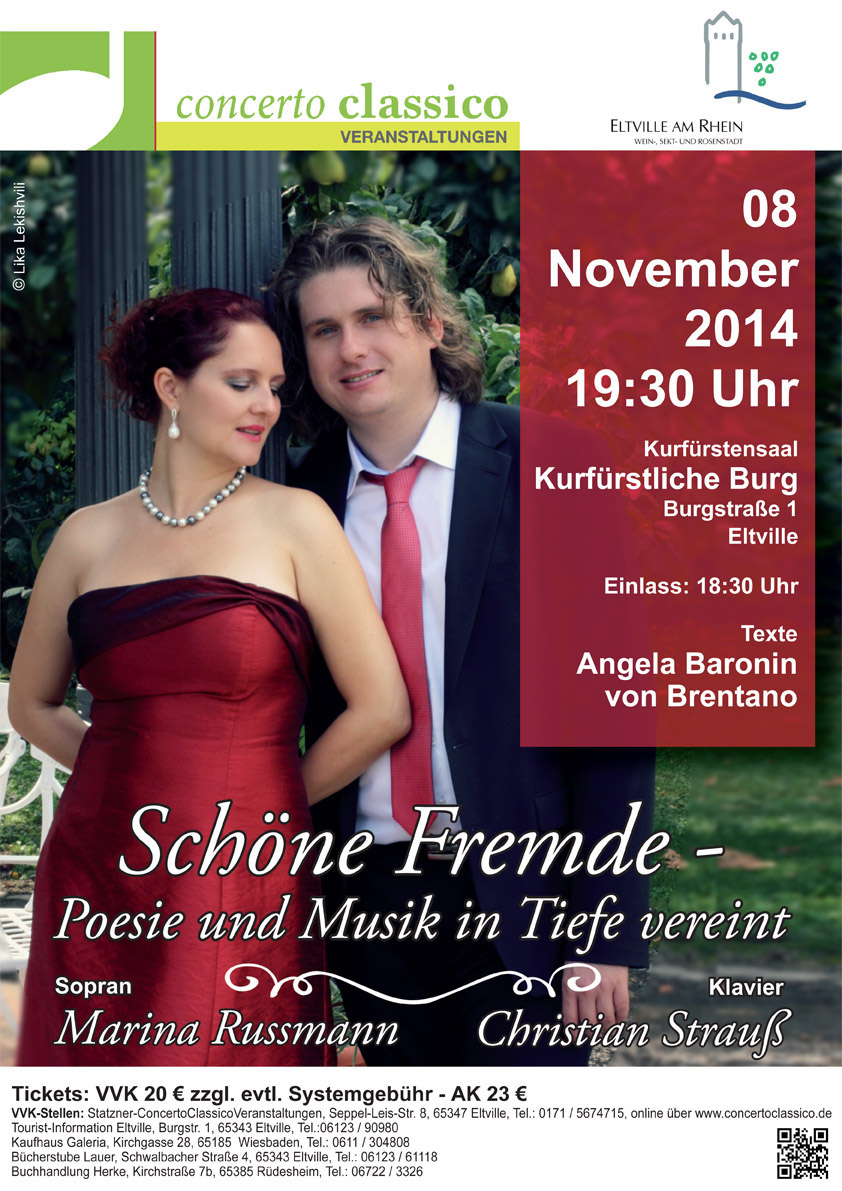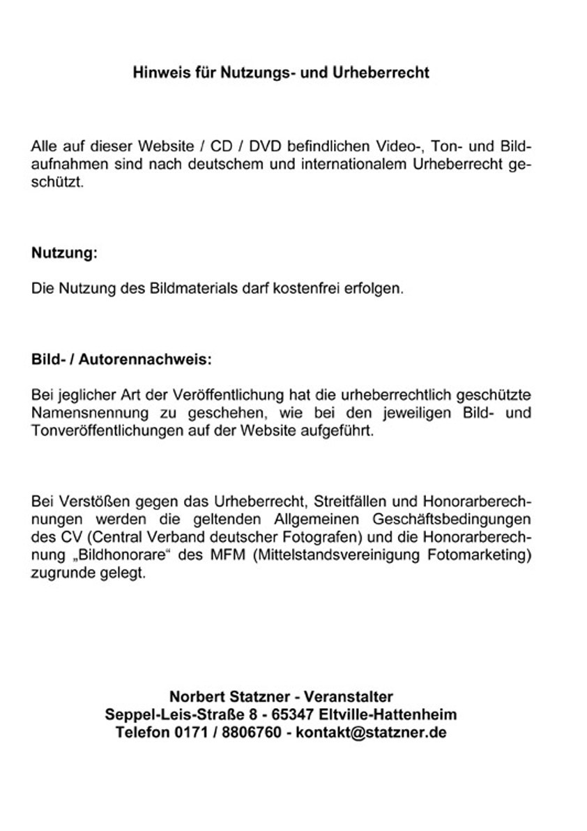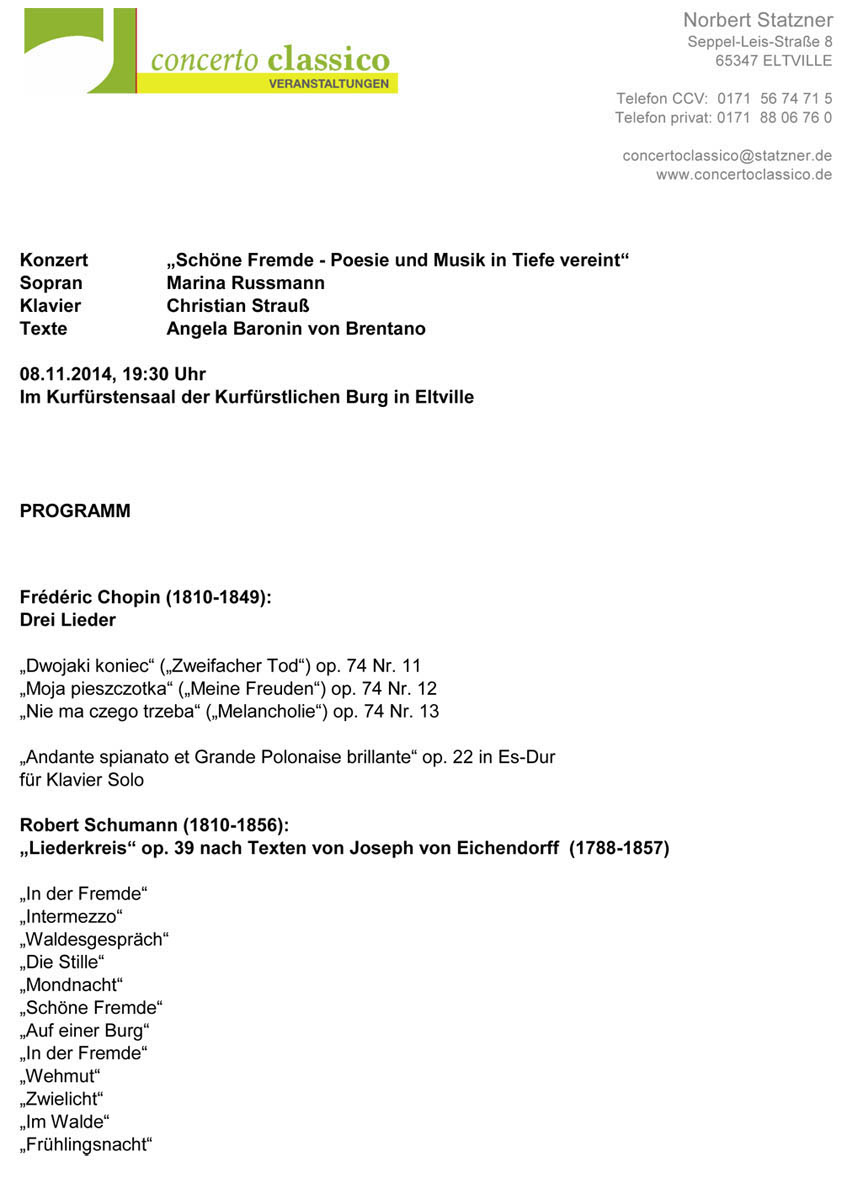 concerto classico Veranstaltungen gUG (haftungsbeschränkt) Norbert Statzner, Seppel-Leis-Straße 8, 65347 Eltville Tel.: (01 71) 5 67 47 15 E-Mail: kontakt@concertoclassico.de |
