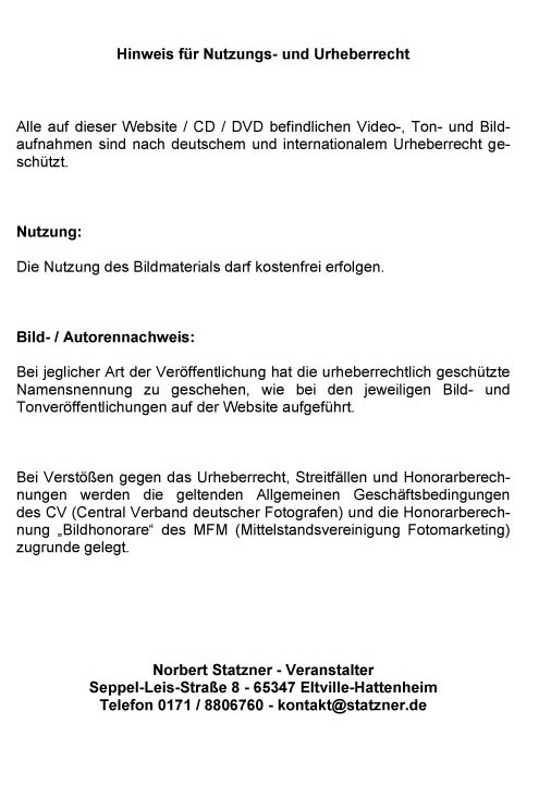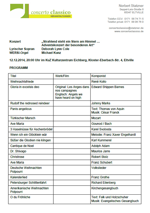 concerto classico Veranstaltungen gUG (haftungsbeschränkt) Norbert Statzner, Seppel-Leis-Straße 8, 65347 Eltville Tel.: (01 71) 5 67 47 15 E-Mail: kontakt@concertoclassico.de |