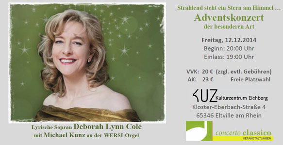 Deborah Lynn Cole, eine amerikanische Sängerin, sang u.a. am Staatstheater Wiesbaden und an der Oper Frankfurt sowie der Deutschen Oper Berlin, liebt aber auch die intime Atmosphäre an kleineren Bühnen. Deborah Cole kennt Michael Kunz, einer der bekanntesten WERSI Orgel-Virtuosen in Deutschland, seit 2005. Er spielt anspruchsvolle Solos und begleitet Deborah kunstvoll mit seinem „kleine Orchester“. Die beide verfügen über ein sehr breit gefächertes Repertoire, das von Klassik, Volksmusik und Musical bis hin zur Jazz- und Popmusik reicht. Titel wie Schuberts "Ave Maria", Dostals "Christrose", "O du Fröhliche", "3 Nüsse für Aschenputtel", "Let it snow" und "White Christmas" werden zu hören und sehen sein. Lassen Sie sich verzaubern durch die strahlende Darbietung von Deborah und Michael.
