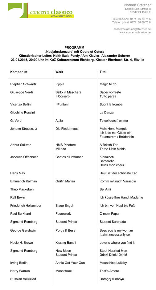 concerto classico Veranstaltungen gUG (haftungsbeschränkt) Norbert Statzner, Seppel-Leis-Straße 8, 65347 Eltville Tel.: (01 71) 5 67 47 15 E-Mail: kontakt@concertoclassico.de |