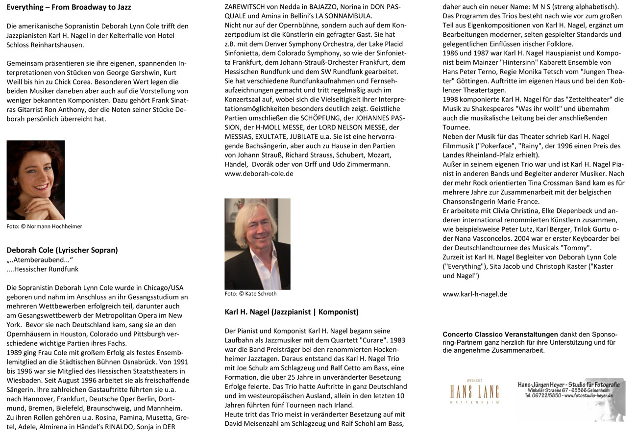 Gemeinsam präsentieren sie ihre eigenen, spannenden Interpretationen von Stücken von George Gershwin, Kurt Weill bis hin zu Chick Corea. Besonderen Wert legen die beiden Musiker daneben aber auch auf die Vorstellung von weniger bekannten Komponisten. Dazu gehört Frank Sinatras Gitarrist Ron Anthony, der die Noten seiner Stücke Deborah persönlich überreicht hat.