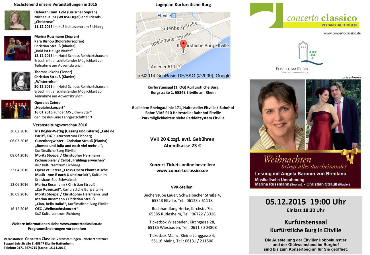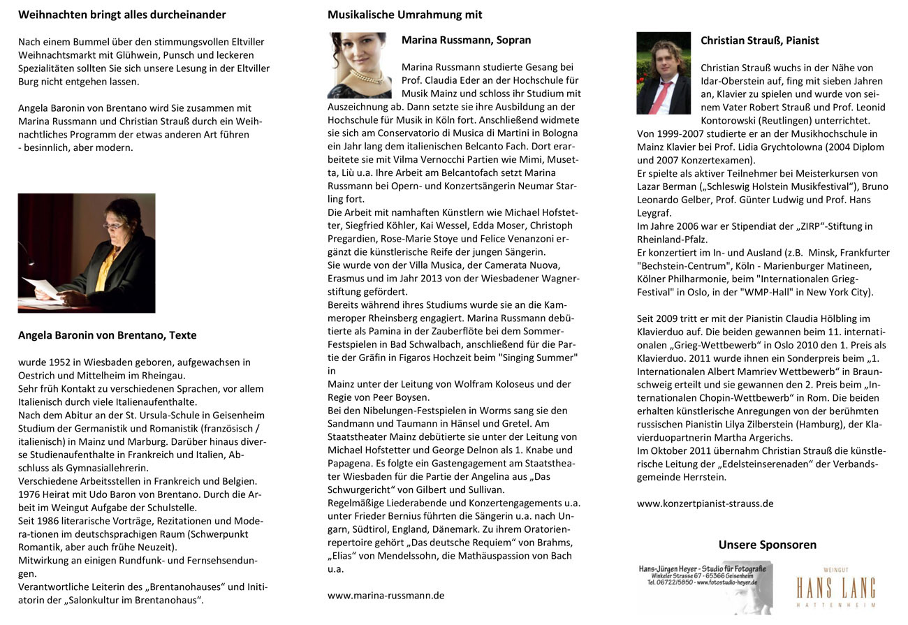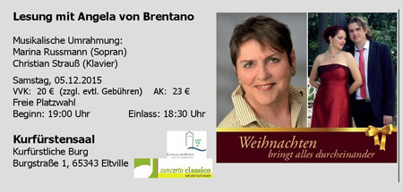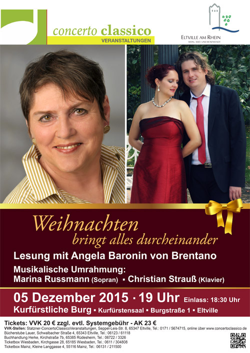 Angela Baronin von Brentano wird Sie zusammen mit Marina Russmann und Christian Strauß durch ein Weihnachtliches Programm der etwas anderen Art führen - besinnlich, aber modern.