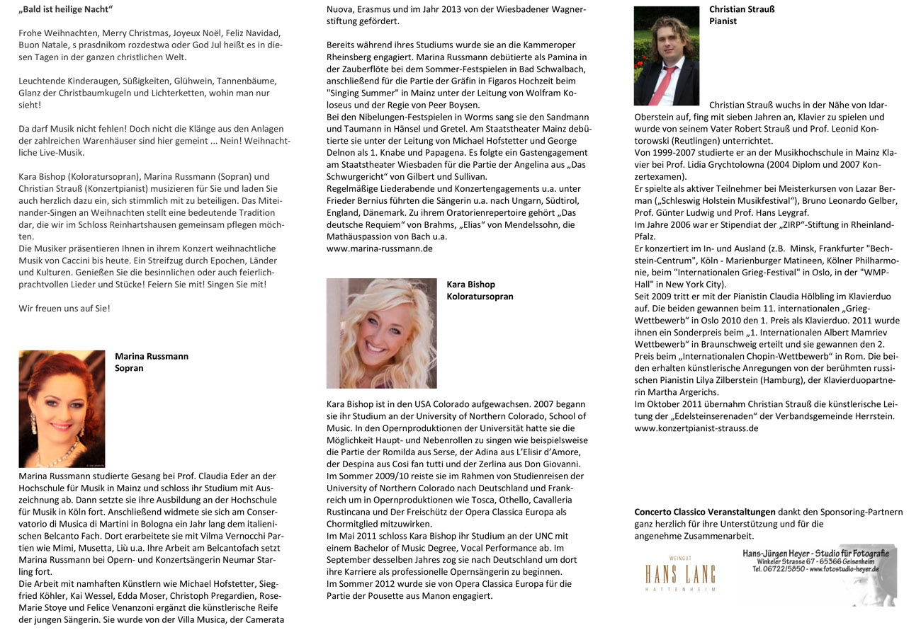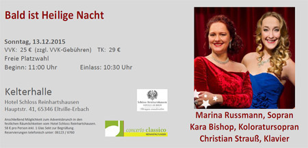Kara Bishop (Koloratursopran), Marina Russmann (Sopran) und Christian Strauß (Konzertpi-anist) musizieren für Sie und laden Sie auch herzlich dazu ein, sich stimmlich mit zu beteili-gen. Das Miteinander-Singen an Weihnachten stellt eine bedeutende Tradition dar, die wir im Schloss Reinhartshausen gemeinsam pflegen möchten.