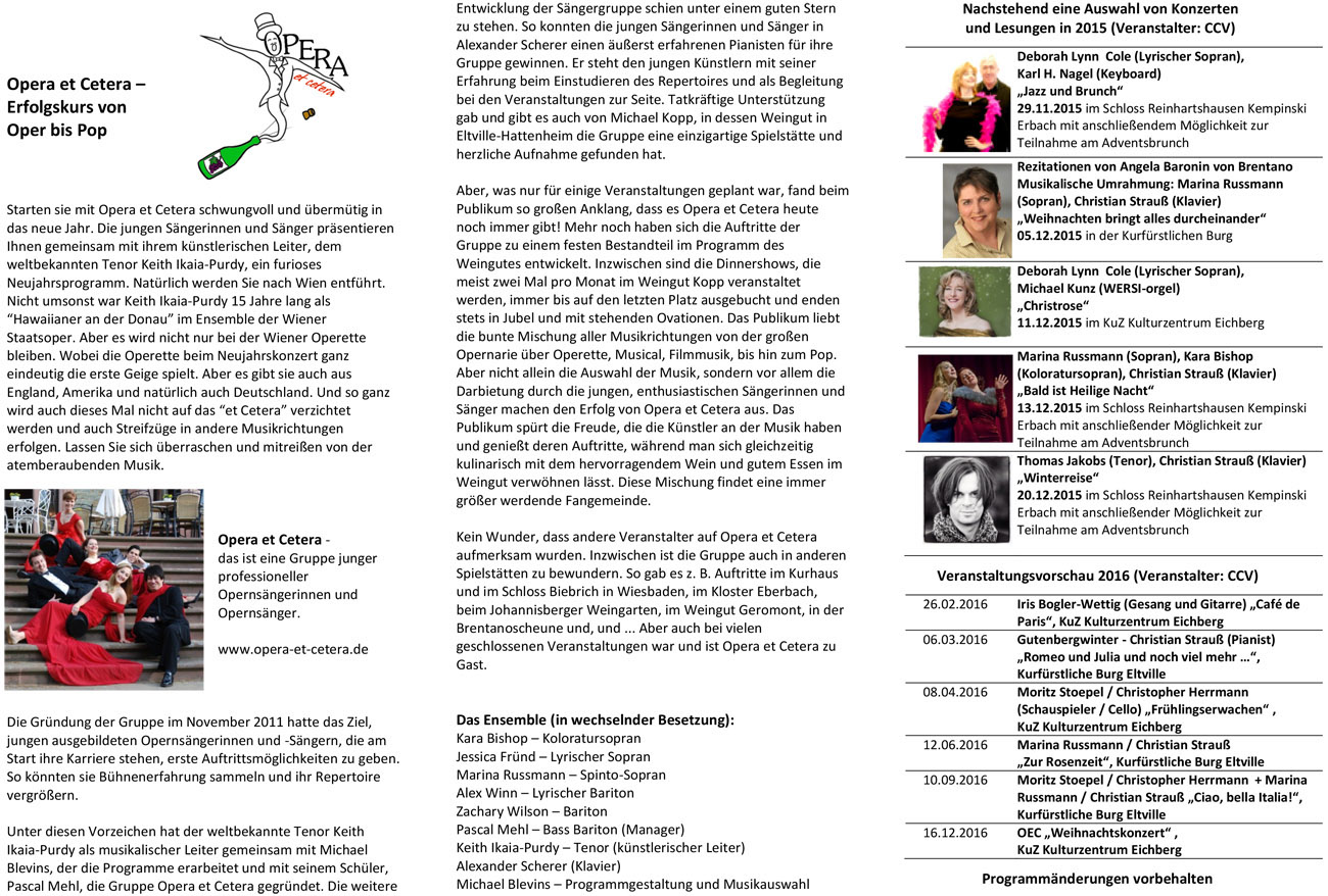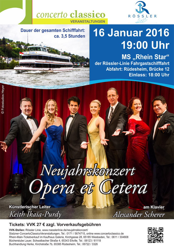 Starten sie mit Opera et Cetera schwungvoll und übermütig in das neue Jahr. Die jungen Sängerinnen und Sänger präsentieren Ihnen gemeinsam mit ihrem künstlerischen Leiter, dem weltbekannten Tenor Keith Ikaia-Purdy, ein furioses Neujahrsprogramm. Natürlich werden Sie nach Wien entführt. Nicht umsonst war Keith Ikaia-Purdy 15 Jahre lang als “Hawaiianer an der Donau” im Ensemble der Wiener Staatsoper. Aber es wird nicht nur bei der Wiener Operette bleiben. Wobei die Operette beim Neujahrskonzert ganz eindeutig die erste Geige spielt. Aber es gibt sie auch aus England, Amerika und natürlich auch Deutschland. Und so ganz wird auch dieses Mal nicht auf das “et Cetera” verzichtet werden und auch Streifzüge in andere Musikrichtungen erfolgen. Lassen Sie sich überraschen und mitreißen von der atemberaubenden Musik.