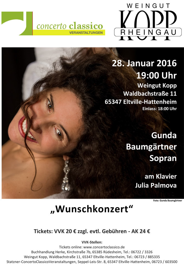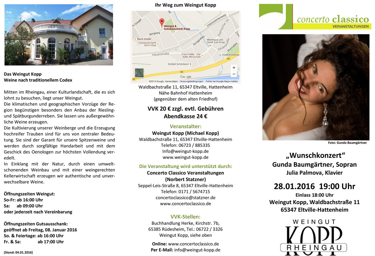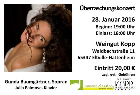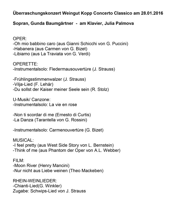 Das Weingut Kopp veranstaltet mit Unterstützung von concerto classico Veranstaltungen gUG (haftungsbeschränkt) ein „Überraschungskonzert“ mit ausgewählten Liedern der Klassik.
