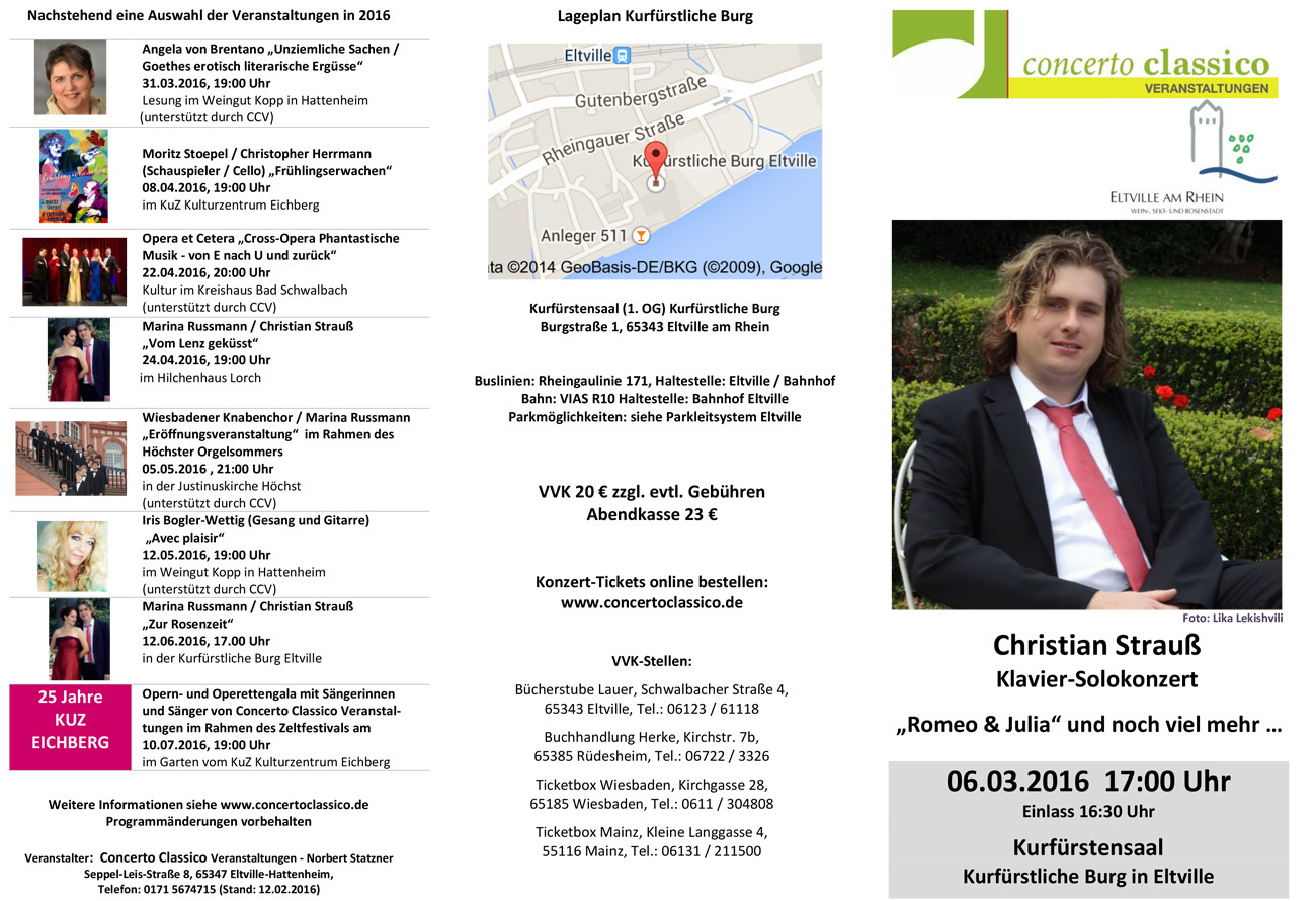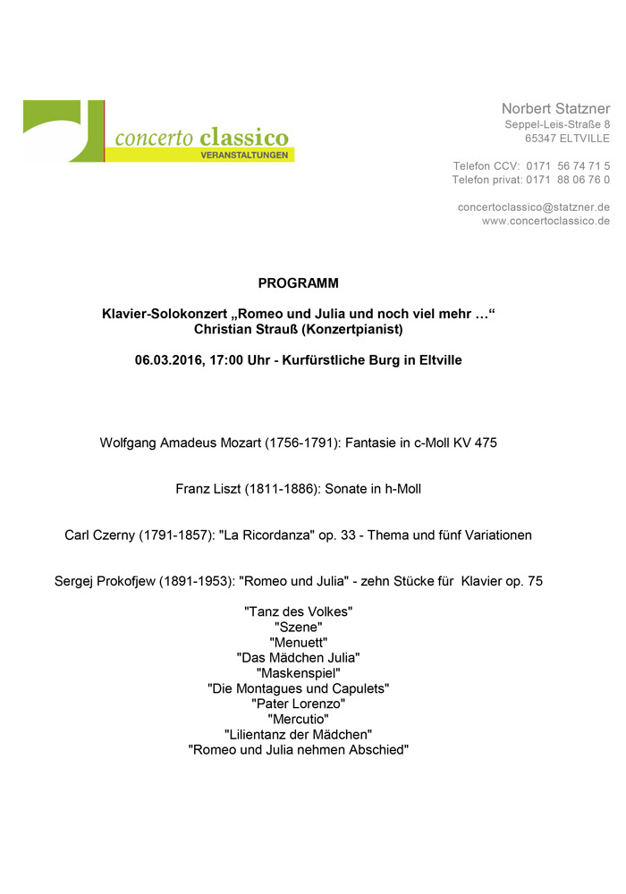 concerto classico Veranstaltungen gUG (haftungsbeschränkt) Norbert Statzner, Seppel-Leis-Straße 8, 65347 Eltville Tel.: (01 71) 5 67 47 15 E-Mail: kontakt@concertoclassico.de |