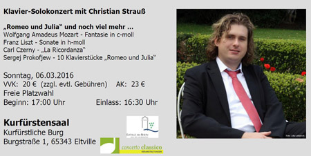 Der Konzertpianist Christian Strauß stellt in seinem Solo-Klavierabend (am Steinway-Flügel) bedeutende Klavierwerke aus verschiedenen Epochen vor.