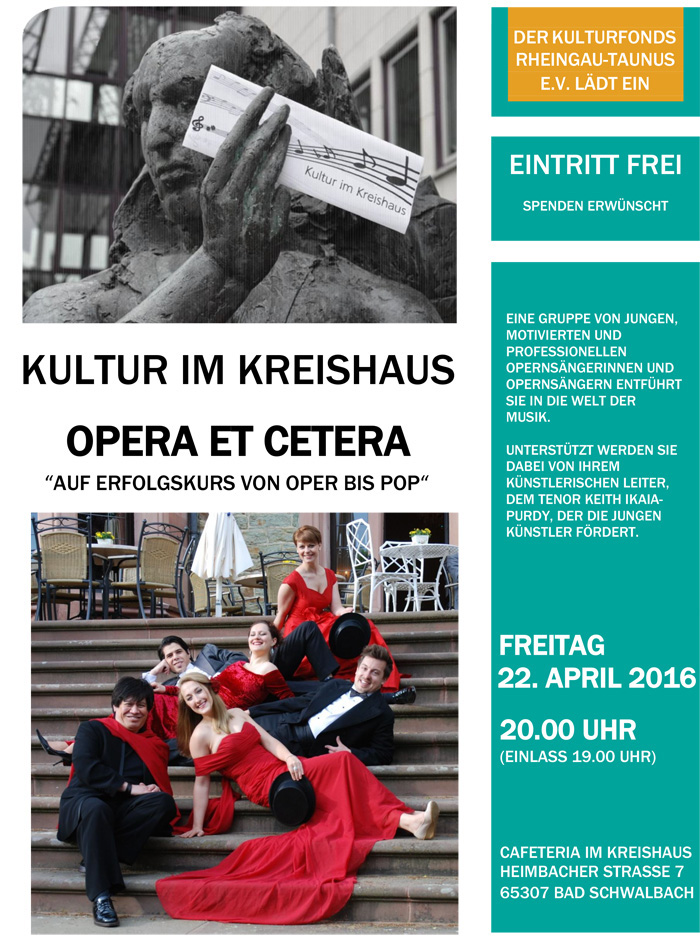 Nun kommt „Opera et Cetera“ zur Konzertreihe „Kultur im Kreishaus“ nach Bad Schwalbach. In der Cafeteria im Kreishaus geht es am Freitag, 22. April 2016, um 20.00 Uhr (Einlass 19.00), los.