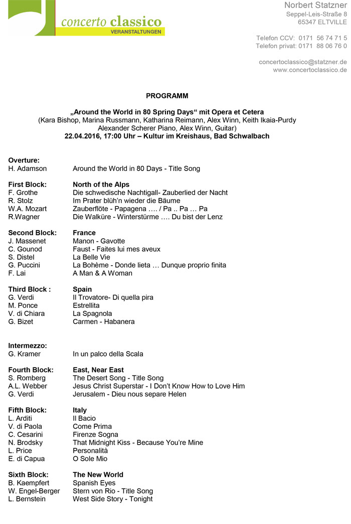 concerto classico Veranstaltungen gUG (haftungsbeschränkt) Norbert Statzner, Seppel-Leis-Straße 8, 65347 Eltville Tel.: (01 71) 5 67 47 15 E-Mail: kontakt@concertoclassico.de |