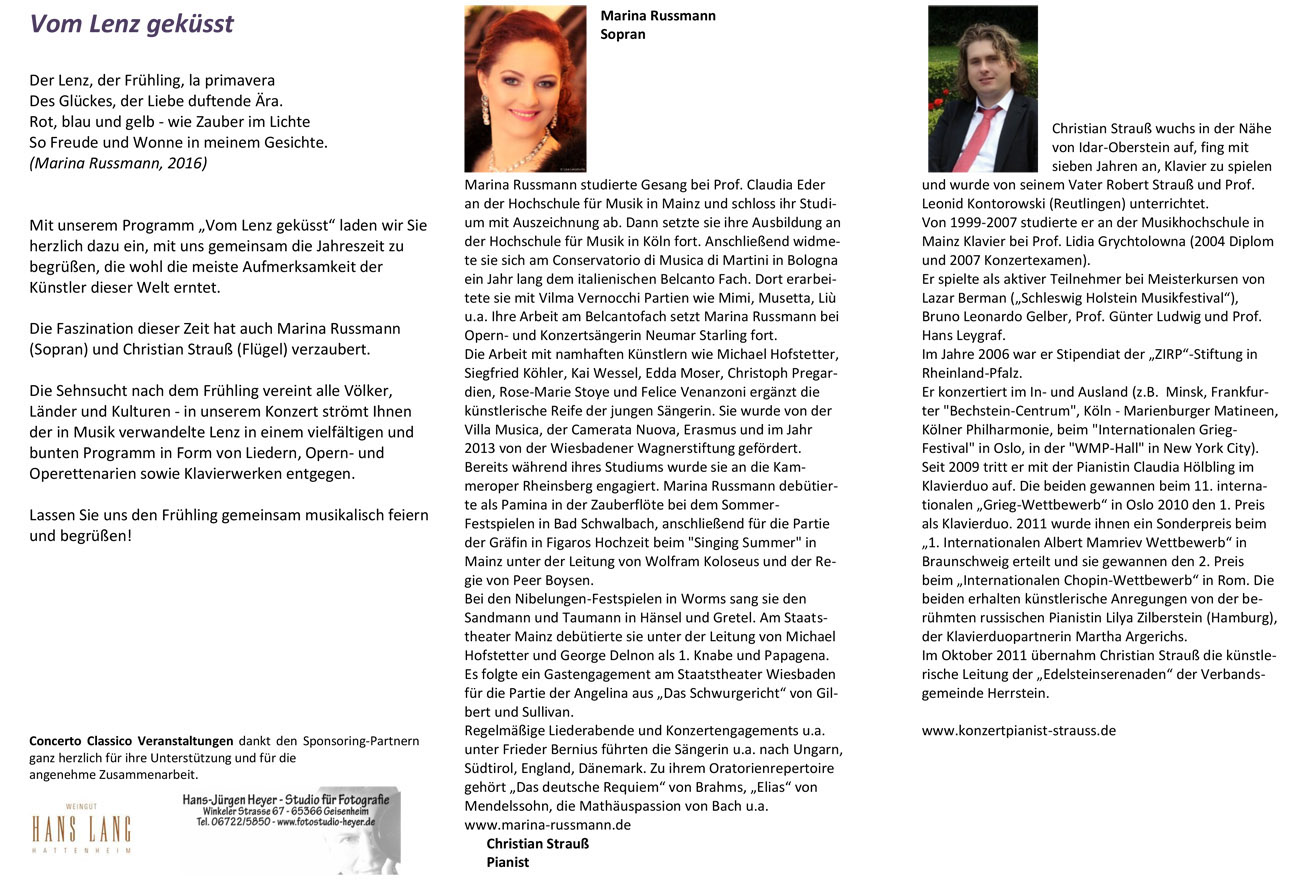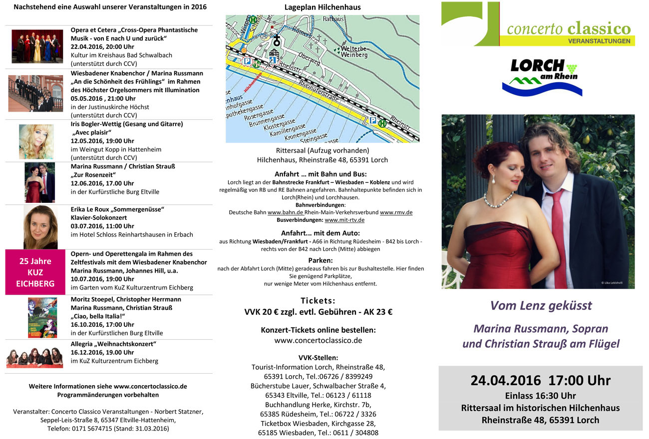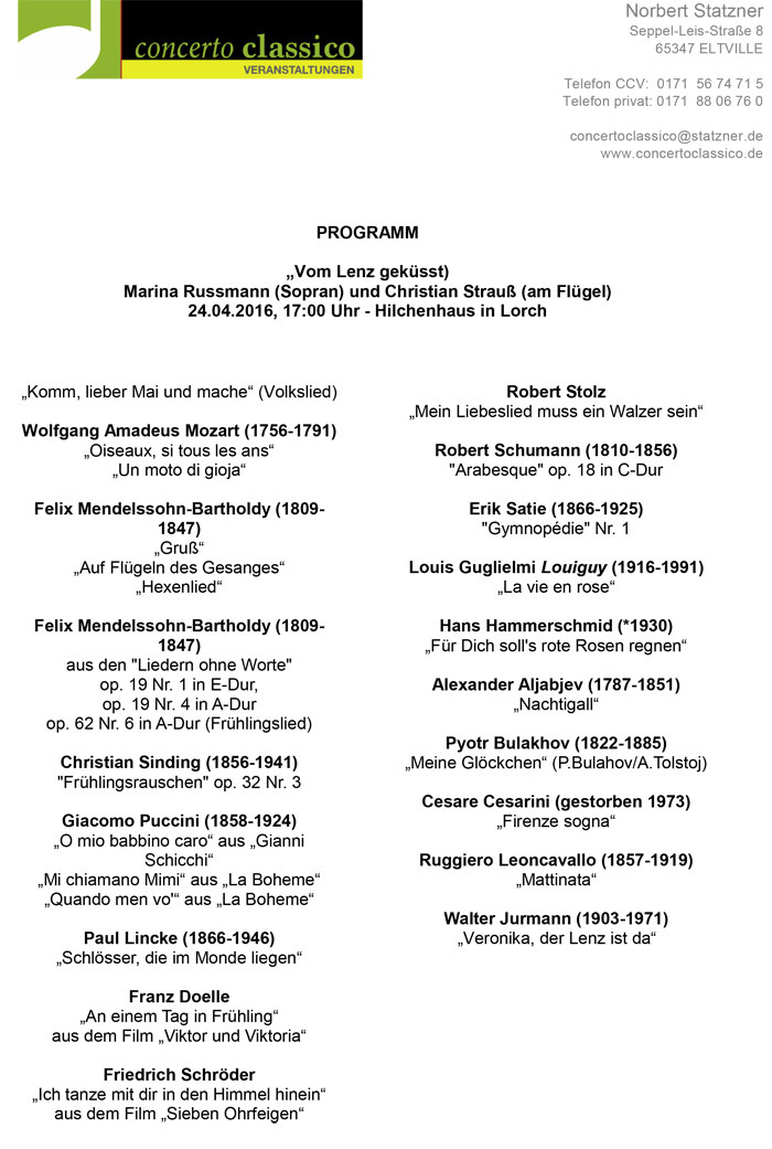 concerto classico Veranstaltungen gUG (haftungsbeschränkt) Norbert Statzner, Seppel-Leis-Straße 8, 65347 Eltville Tel.: (01 71) 5 67 47 15 E-Mail: kontakt@concertoclassico.de |