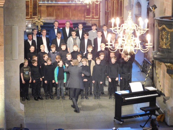 Die Festival-Eröffnung, in diesem Fall um 21:00 Uhr, mit dem Wiesbadener Knabenchor, Sopran und Orgel, ist mit einer Illumination des karolingischen Raumes verbunden. Die Sonne ist der ursächliche Grund dafür, dass dieses Konzert so spät anfängt, denn erst wenn sie untergegangen ist, können wir illuminieren. Die Knabenstimmen müssen in der Pau-se rasch ins Bett, die Männerstimmen singen im zweiten Teil allein.