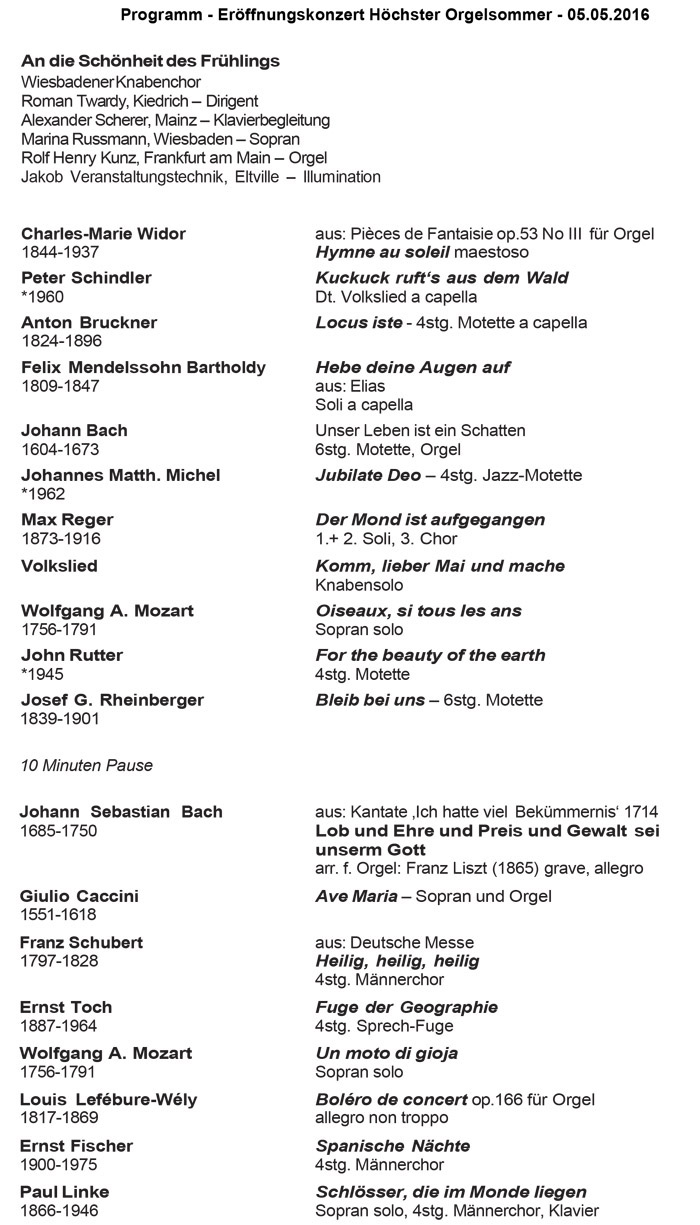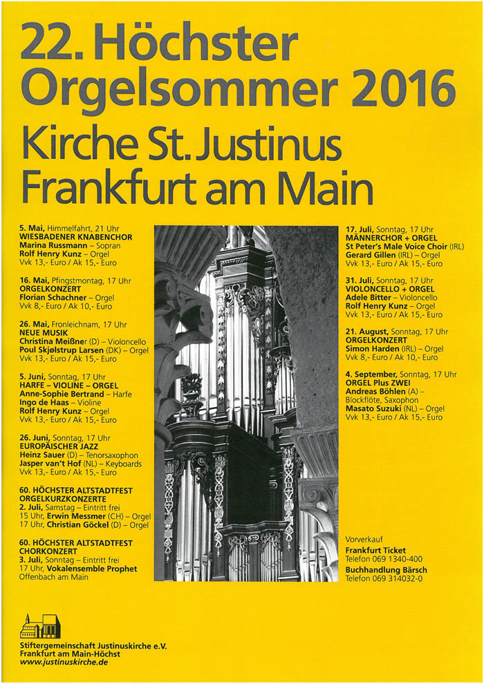 St. Justinus Höchst, eine der ältesten Kirchen Deutschlands, wird 2016 wieder Stätte eines international beachteten Musikfestivals. Willkommen zum Höchster Orgelsommer! Die Stiftergemeinschaft Justinuskirche e.V. hat sich zur Aufgabe gemacht, das karolingische Gotteshaus in bestem Zustand der Nachwelt zu erhalten. Erhebliche Spendengelder werden in die Instandhaltung, Restaurierung und kunstvolle Ausstattung investiert. Seit 1736 erklingt die prächtige Barockorgel des Mainzer Orgelbauers Onimus. Sie wurde 1988 durch die Schweizer Firma Kuhn von Grund auf erneuert, die Disposition für den Kon-zertanspruch erweitert, das barocke Pfeifenmaterial restauriert und meisterhaft in den Ge-samtklang integriert. Der Orgelprospekt ist original erhalten.