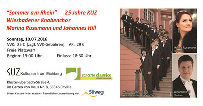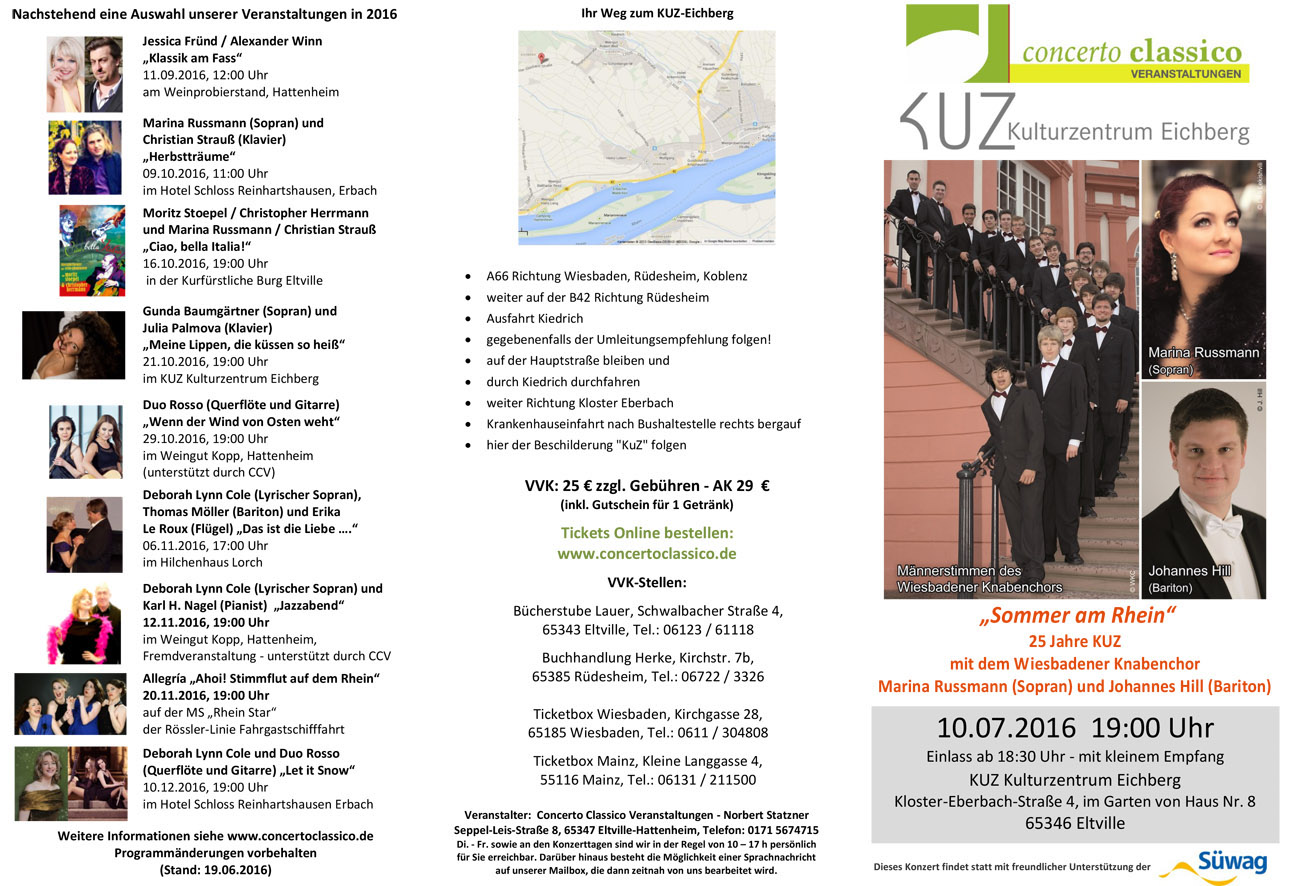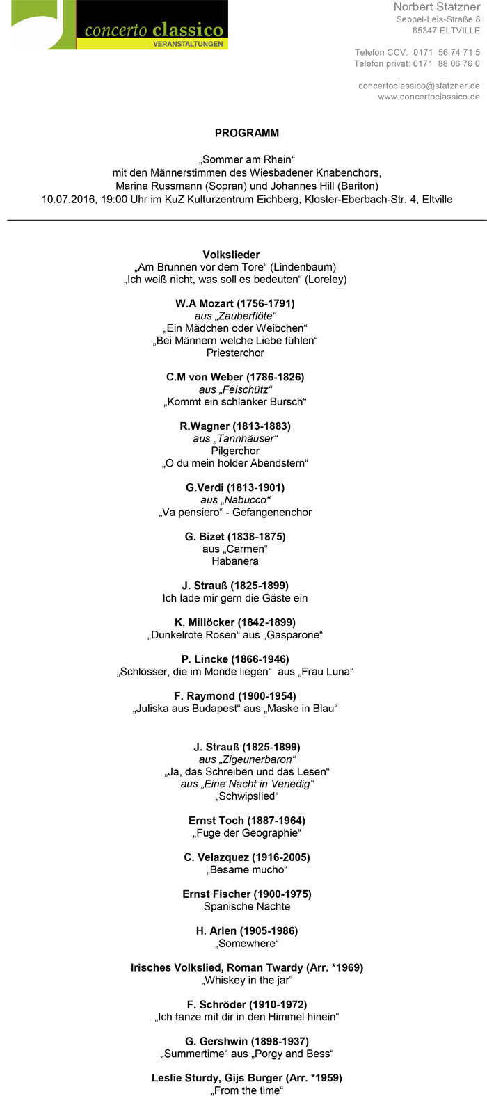 concerto classico Veranstaltungen gUG (haftungsbeschränkt) Norbert Statzner, Seppel-Leis-Straße 8, 65347 Eltville Tel.: (01 71) 5 67 47 15 E-Mail: kontakt@concertoclassico.de |
