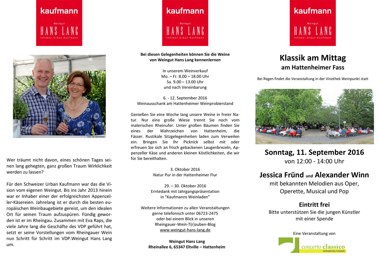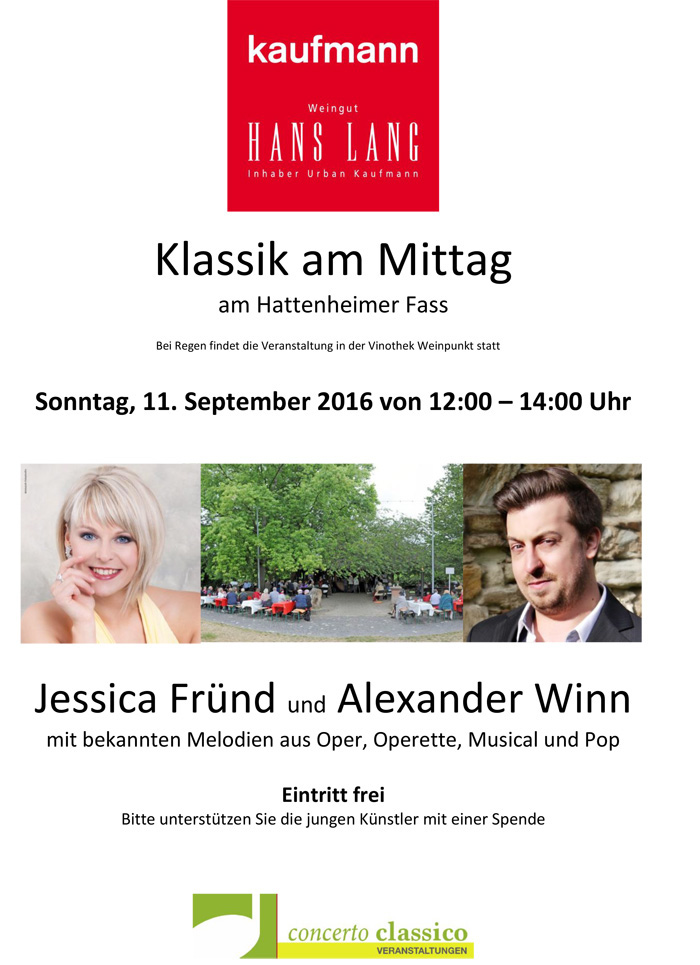 Auch wenn die Wetterkapriolen im Juni eine Verlegung der Veranstaltung „Klassik am Mittag“ in den nahegelegenen Weinpunkt notwendig machten, wird es während der Weinstandswoche des Weingutes Lang (Inhaber Eva Raps und Urban Kaufmann) wegen des anhaltenden Erfolges zu einer weiteren Auflage von „Klassik am Mittag“ am Hattenheimer Fass kommen.