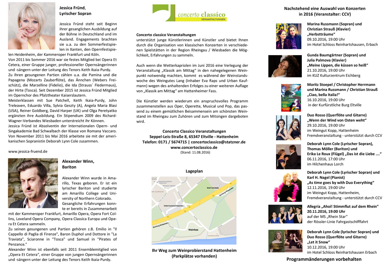 Die Künstler werden ein anspruchsvolles Programm zusammenstellen aus Oper, Operette, Musical und Pop, das passend zu einem gemütlichen Beisammensein am schönsten Weinstand im Rheingau zum Zuhören und zum Mitsingen dargeboten werden.
