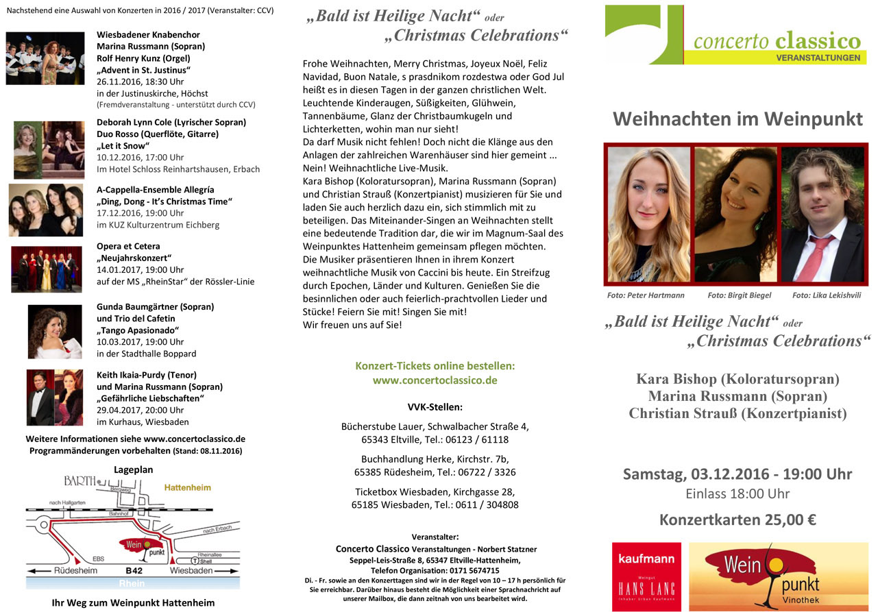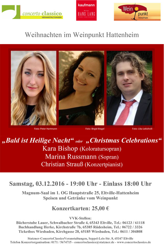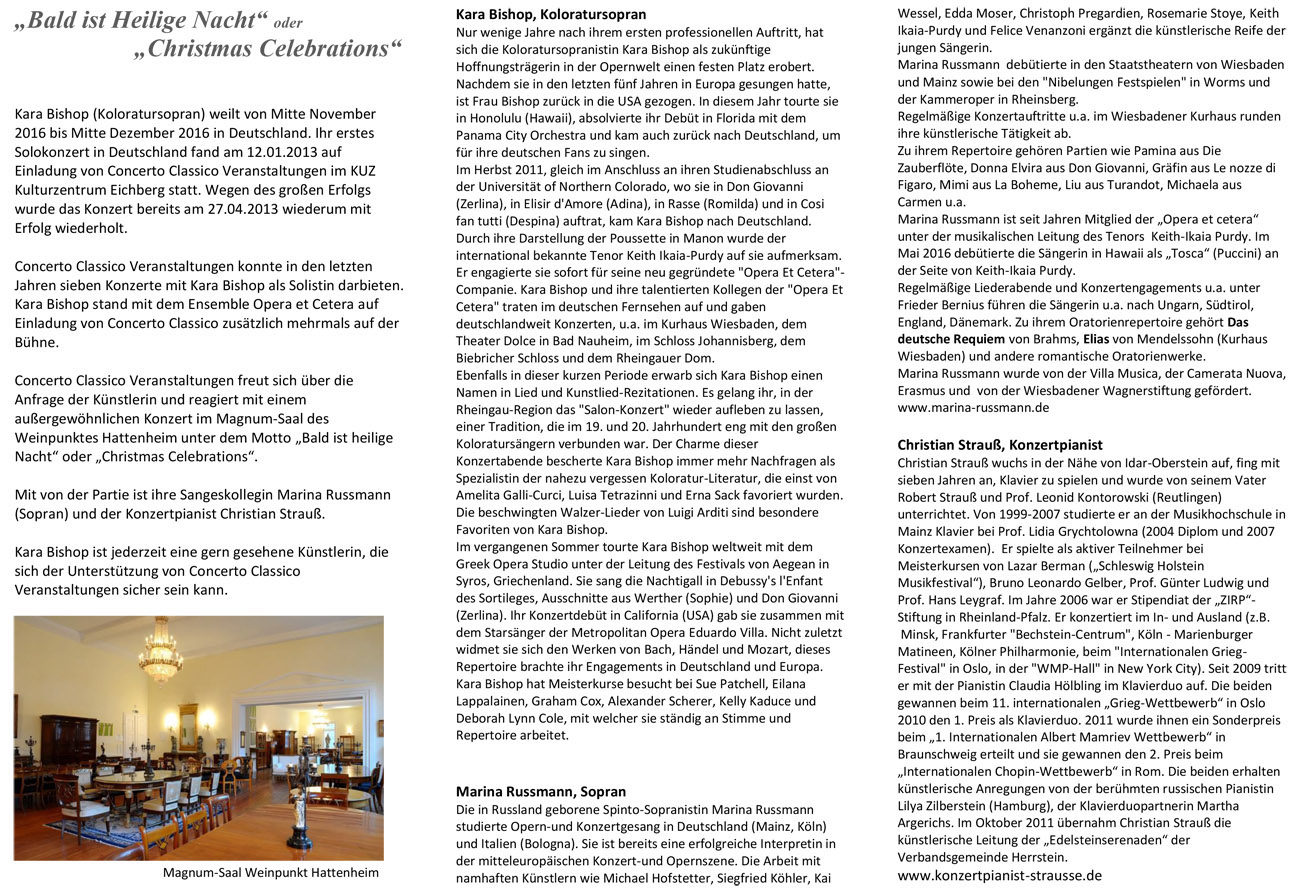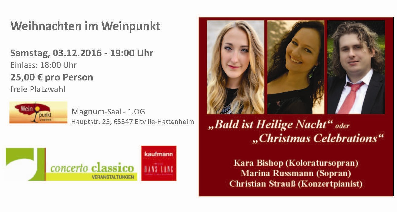 concerto classico Veranstaltungen gUG (haftungsbeschränkt) freut sich über die Anfrage der Künstlerin und reagiert mit einem außergewöhnlichen Konzert im Magnum-Saal des Weinpunktes Hattenheim unter dem Motto „Bald ist heilige Nacht“ oder „Christmas Celebrations“.