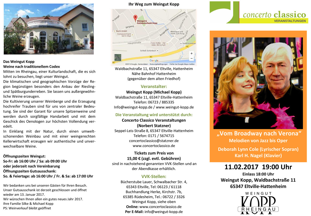 concerto classico Veranstaltungen gUG (haftungsbeschränkt) Norbert Statzner, Seppel-Leis-Straße 8, 65347 Eltville Tel.: (01 71) 5 67 47 15 E-Mail: kontakt@concertoclassico.de |