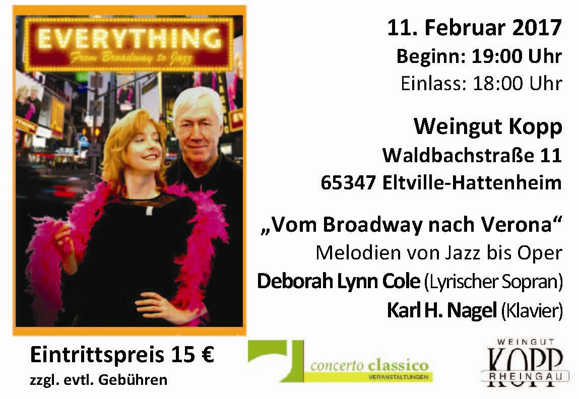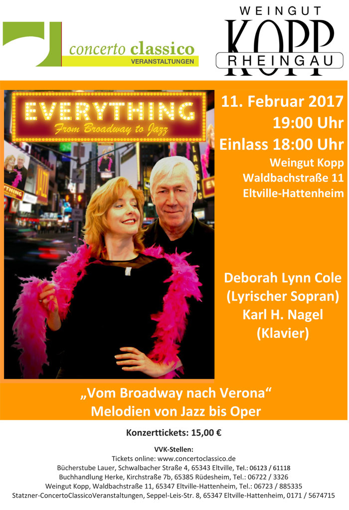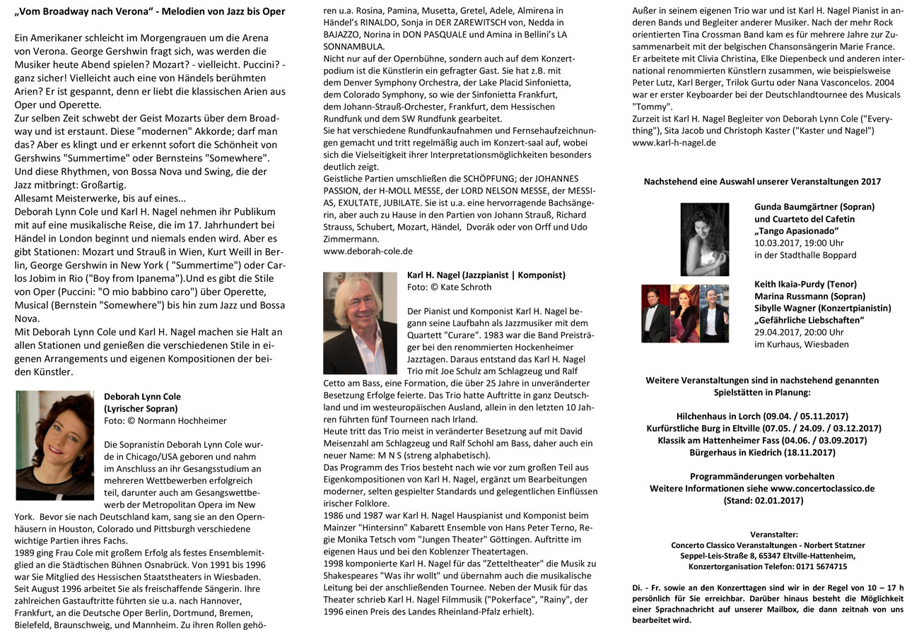 Deborah Lynn Cole und Karl H. Nagel nehmen ihr Publikum mit auf eine musikalische Reise, die im 17. Jahrhundert bei Händel in London beginnt und niemals enden wird. Aber es gibt Stationen: Mozart und Strauß in Wien, Kurt Weill in Berlin, George Gershwin in New York ( "Summertime") oder Carlos Jobim in Rio ("Boy from Ipanema").Und es gibt die Stile von Oper (Puccini: "O mio babbino caro") über Ope-rette, Musical (Bernstein "Somewhere") bis hin zum Jazz und Bossa Nova.