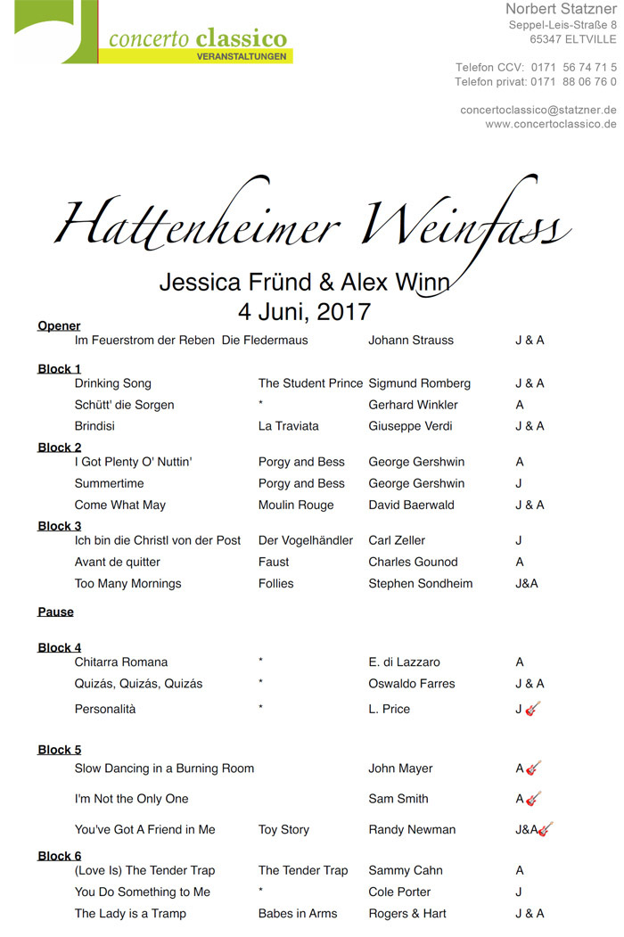 Die Künstler werden ein anspruchsvolles Programm zusammenstellen aus Oper, Operette, Musical und Pop, das passend zu einem gemütlichen Beisammensein am schönsten Weinstand im Rheingau zum Zuhören und zum Mitsingen dargeboten werden.