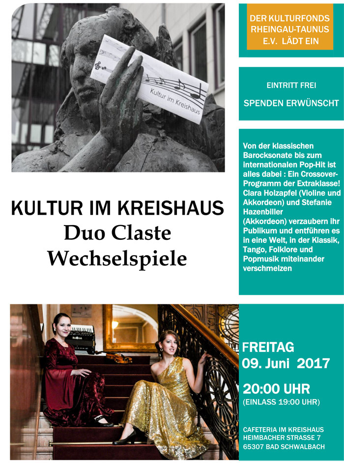 Das „Duo Claste“ besteht aus den Musikerinnen Clara Holzapfel und Stefanie Hazenbiller, die sich 2010 als Studentinnen kennenlernten und bereits im selben Jahr das Duo gründeten. Zunächst durch ihre gemeinsame Dozentin als Projekt für ein Konzert zusammengewürfelt, wurde schnell klar, dass die beiden musikalisch auf einer Wellenlänge schwingen. So nahm die Geschichte des „Duos Claste“ ihren Anfang und bleibt bis heute bestehen. Am Freitag, 9. Juni 2017, gastieren die beiden Musikerinnen nun bei „Kultur im Kreishaus“ in Bad Schwal-bach. Los geht es um 20.00 Uhr (Eintritt ab 19.00 Uhr). Der Eintritt ist wie immer frei; um eine Spende wird gebeten. Nach dem Konzert besteht die Möglichkeit bei Wein und Gebäck für einen Plausch mit den beiden Musikerinnen.