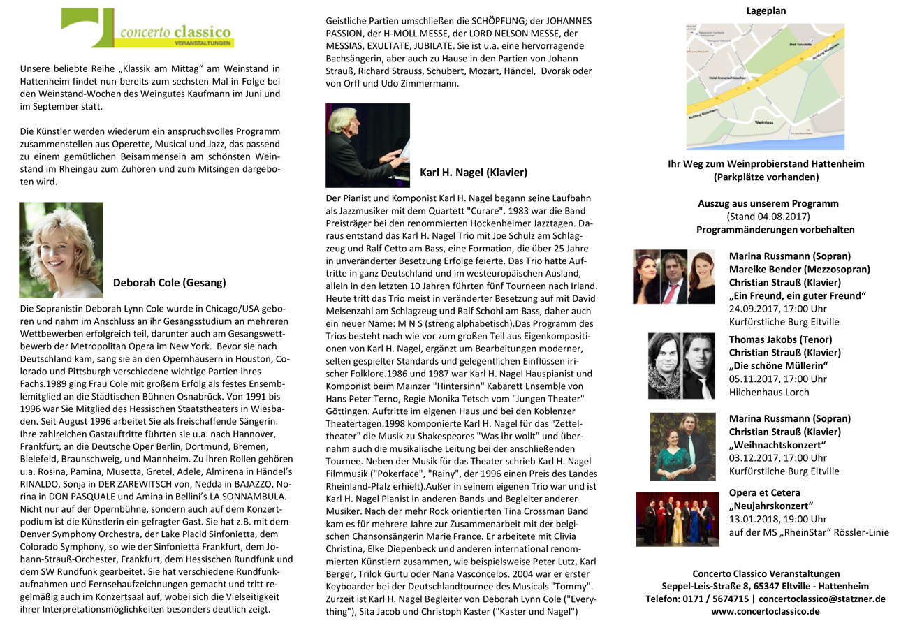 concerto classico Veranstaltungen gUG (haftungsbeschränkt) Norbert Statzner, Seppel-Leis-Straße 8, 65347 Eltville Tel.: (01 71) 5 67 47 15 E-Mail: kontakt@concertoclassico.de |