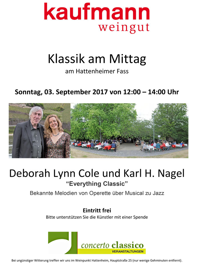 Die Künstler werden ein anspruchsvolles Programm zusammenstellen aus Operette, Musical und Jazz, das passend zu einem gemütlichen Beisammensein am schönsten Weinstand im Rheingau zum Zuhören und zum Mitsingen dargeboten wird.