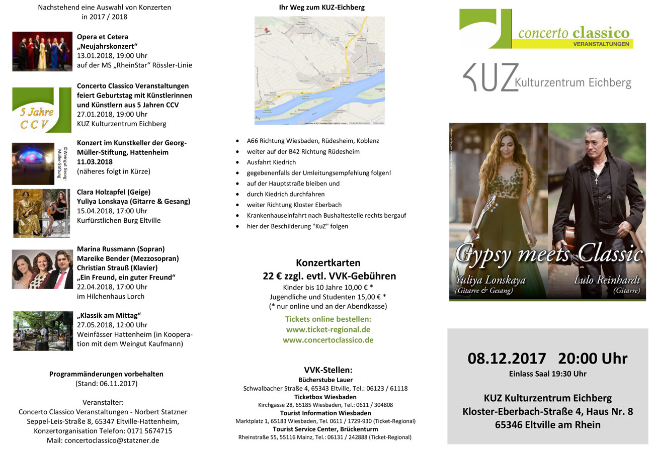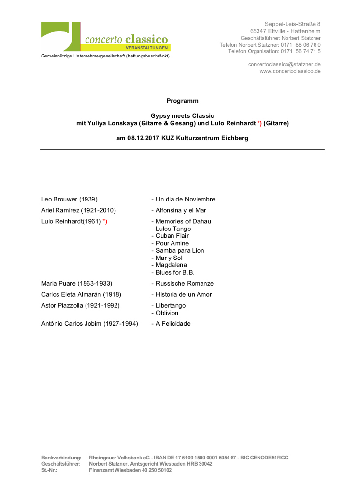 concerto classico Veranstaltungen gUG (haftungsbeschränkt) Norbert Statzner, Seppel-Leis-Straße 8, 65347 Eltville Tel.: (01 71) 5 67 47 15 E-Mail: kontakt@concertoclassico.de |
