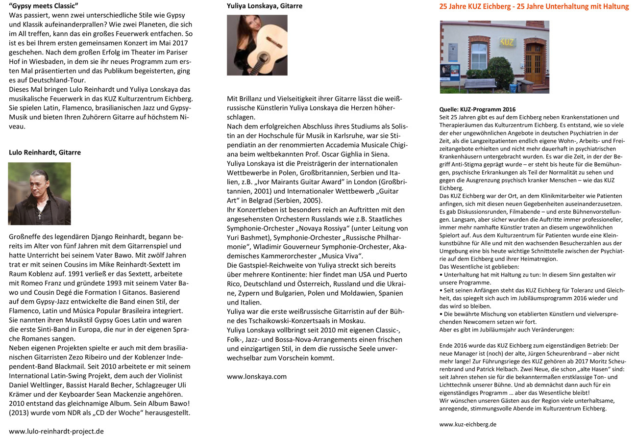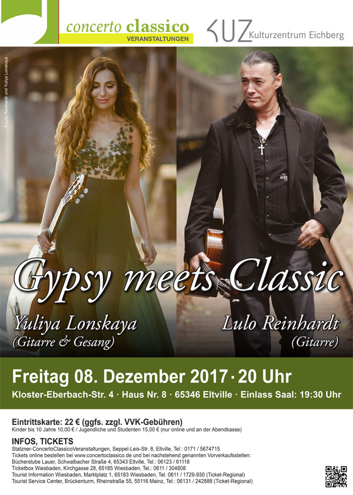 Dieses Mal bringen Lulo Reinhardt und Yuliya Lonskaya das musikalische Feuerwerk in das KUZ Kulturzentrum Eichberg. Sie spielen Latin, Flamenco, brasilianischen Jazz und Gypsy-Musik und bieten Ihren Zuhörern Gitarre auf höchstem Niveau.