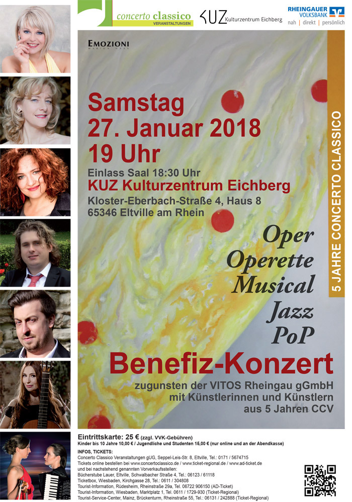 Den Reinerlös des Konzertes werden wir den Vitos-Kliniken Rheingau zweckgebunden, d. h. zur Verwendung im künstlerischen Bereich zur Verfügung stellen.