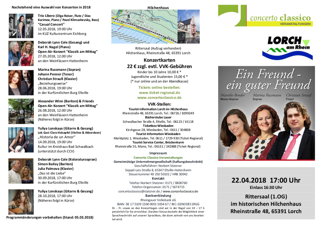 concerto classico Veranstaltungen gUG (haftungsbeschränkt) Norbert Statzner, Seppel-Leis-Straße 8, 65347 Eltville Tel.: (01 71) 5 67 47 15 E-Mail: kontakt@concertoclassico.de |