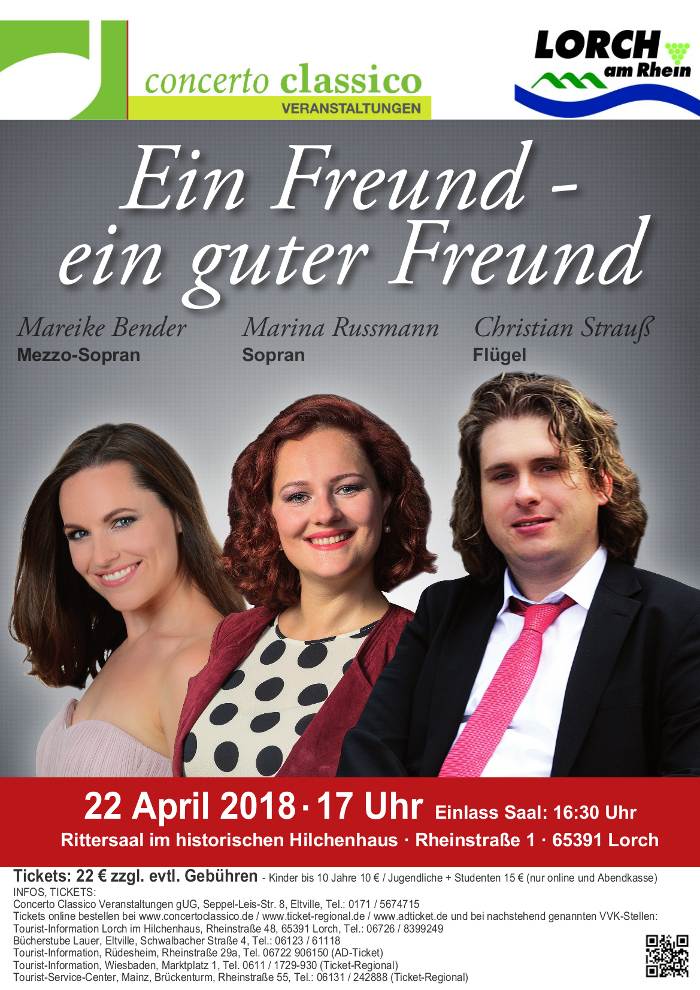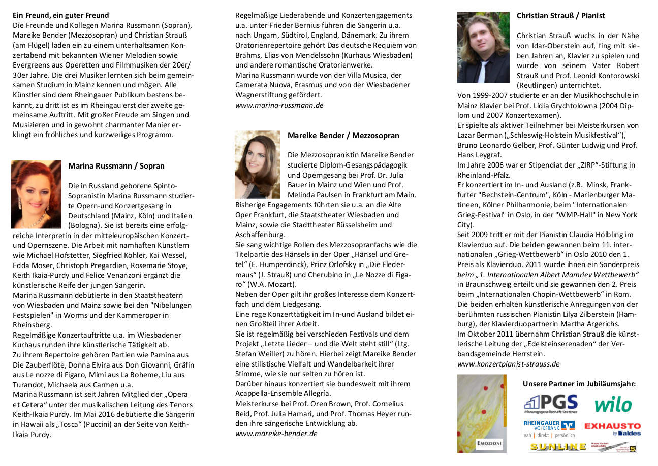 Die Freunde und Kollegen Marina Russmann (Sopran), Mareike Bender (Mezzosopran) und Christian Strauß (am Flügel) laden ein zu einem unterhaltsamen Konzertabend mit bekannten Wiener Melodien sowie Evergreens aus Operetten und Filmmusiken der 20er/30er Jahre. Die drei Musiker lernten sich beim gemeinsamen Studium in Mainz kennen und mögen. Alle Künstler sind dem Rheingauer Publikum bestens bekannt, zu dritt ist es im Rheingau erst der zweite gemeinsame Auftritt. Mit großer Freude am Singen und Musizieren und in gewohnt charmanter Manier erklingt ein fröhliches und kurzweiliges Programm.