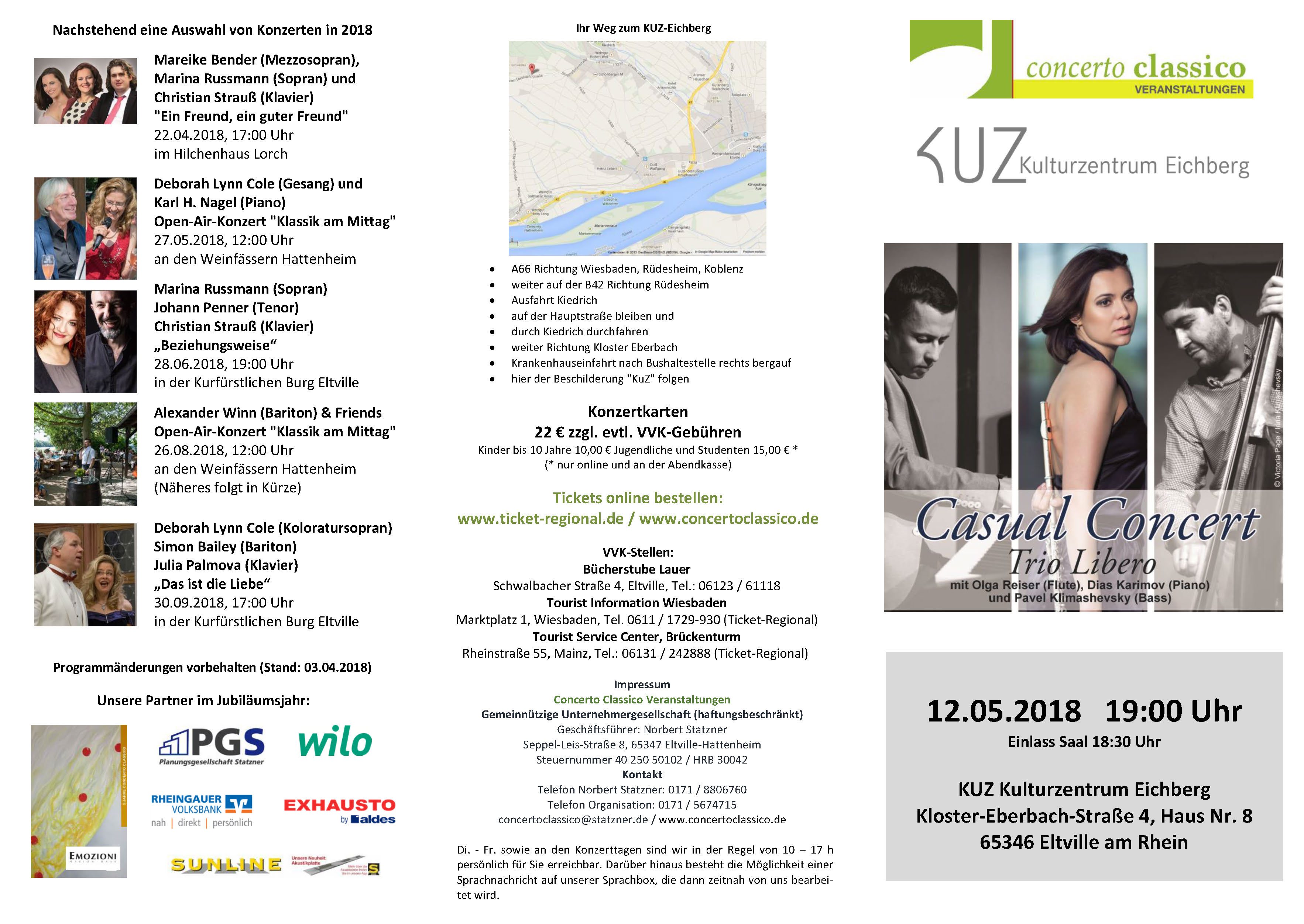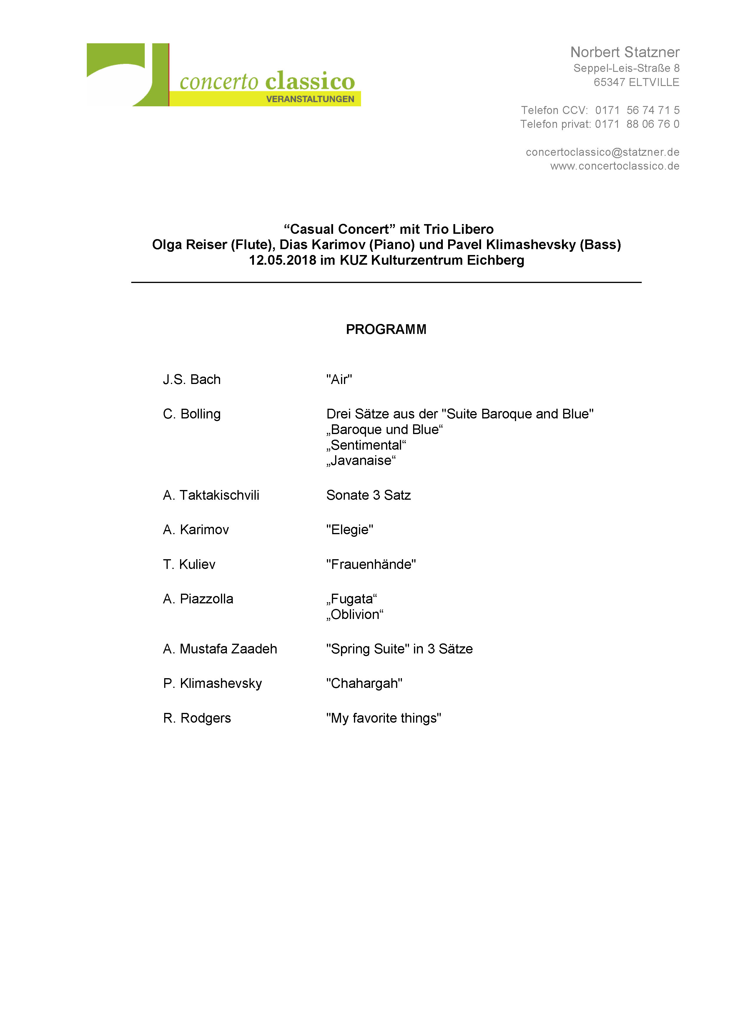 concerto classico Veranstaltungen gUG (haftungsbeschränkt) Norbert Statzner, Seppel-Leis-Straße 8, 65347 Eltville Tel.: (01 71) 5 67 47 15 E-Mail: kontakt@concertoclassico.de |
