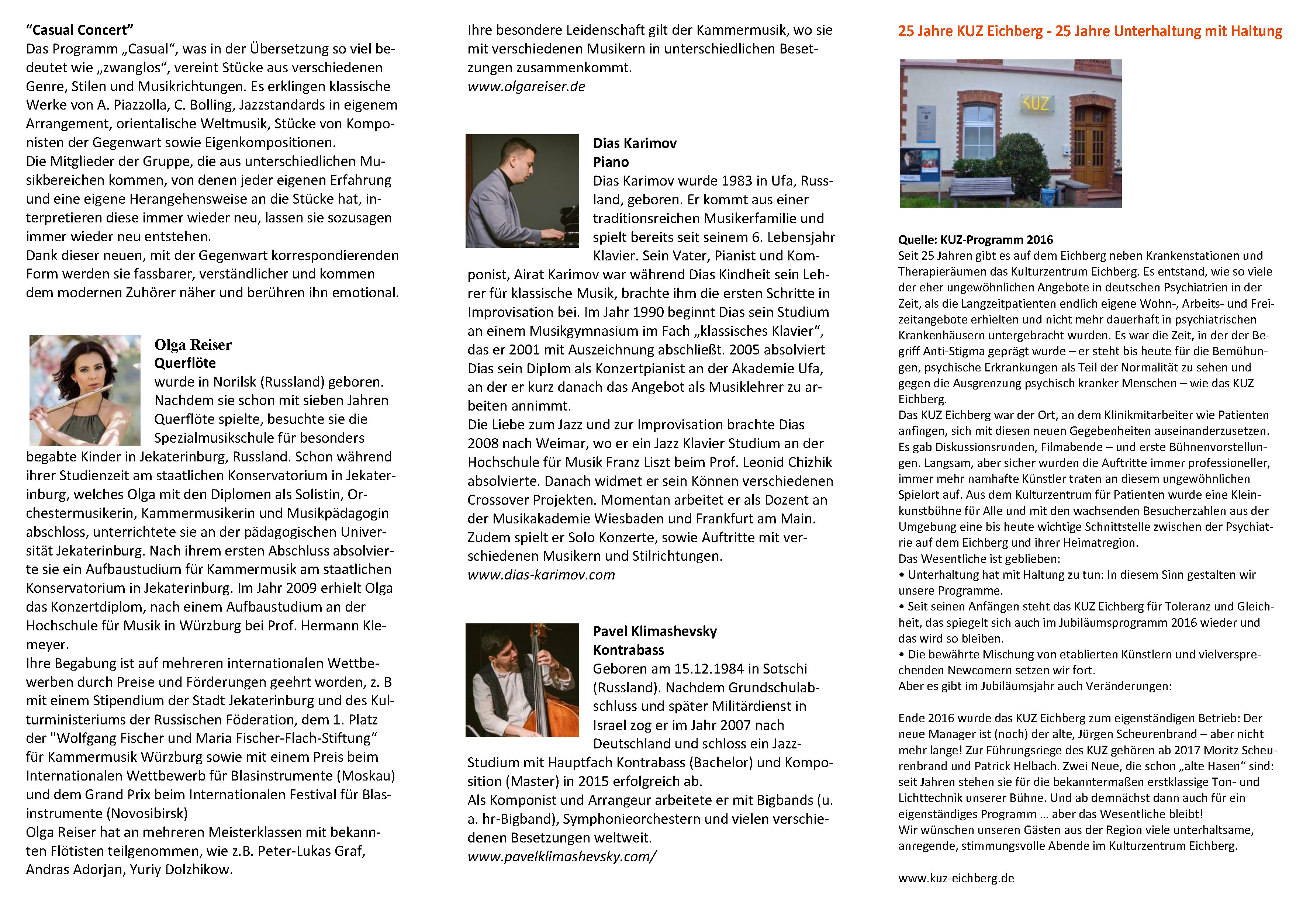 Das Programm „Casual“, was in der Übersetzung so viel bedeutet wie „zwanglos“, vereint Stücke aus verschiedenen Genre, Stilen und Musikrichtungen. Es erklingen klassische Werke von A. Piazzolla, C. Bolling, Jazzstandards in eigenem Arrangement, orientalische Weltmusik, Stücke von Komponisten der Gegenwart sowie Eigenkompositionen.