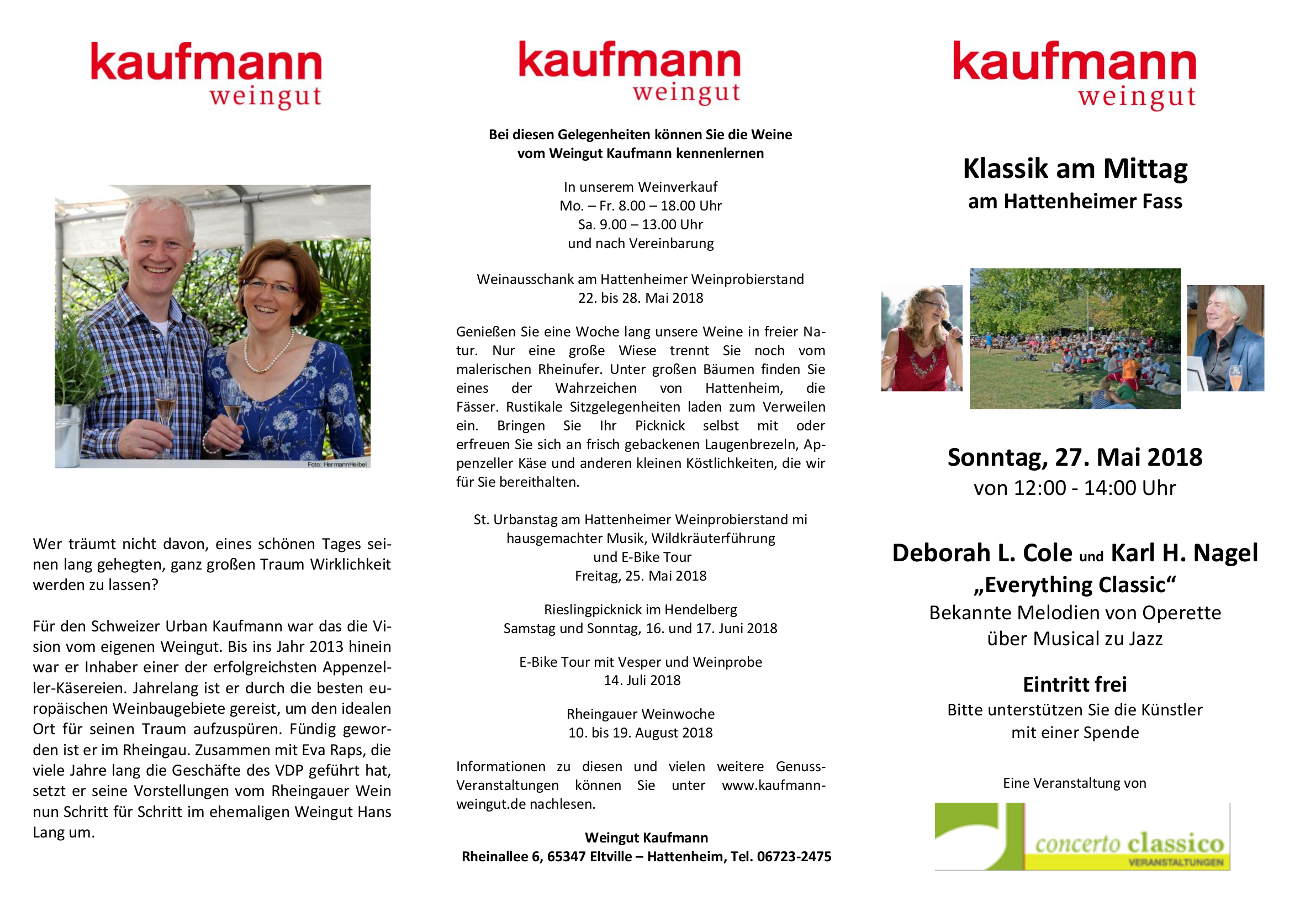 Unsere beliebte Reihe „Klassik am Mittag“ am Weinstand in Hattenheim findet nun bereits zum siebten Mal bei den Weinstand-Wochen des Weingutes Kaufmann im Juni und im September statt.