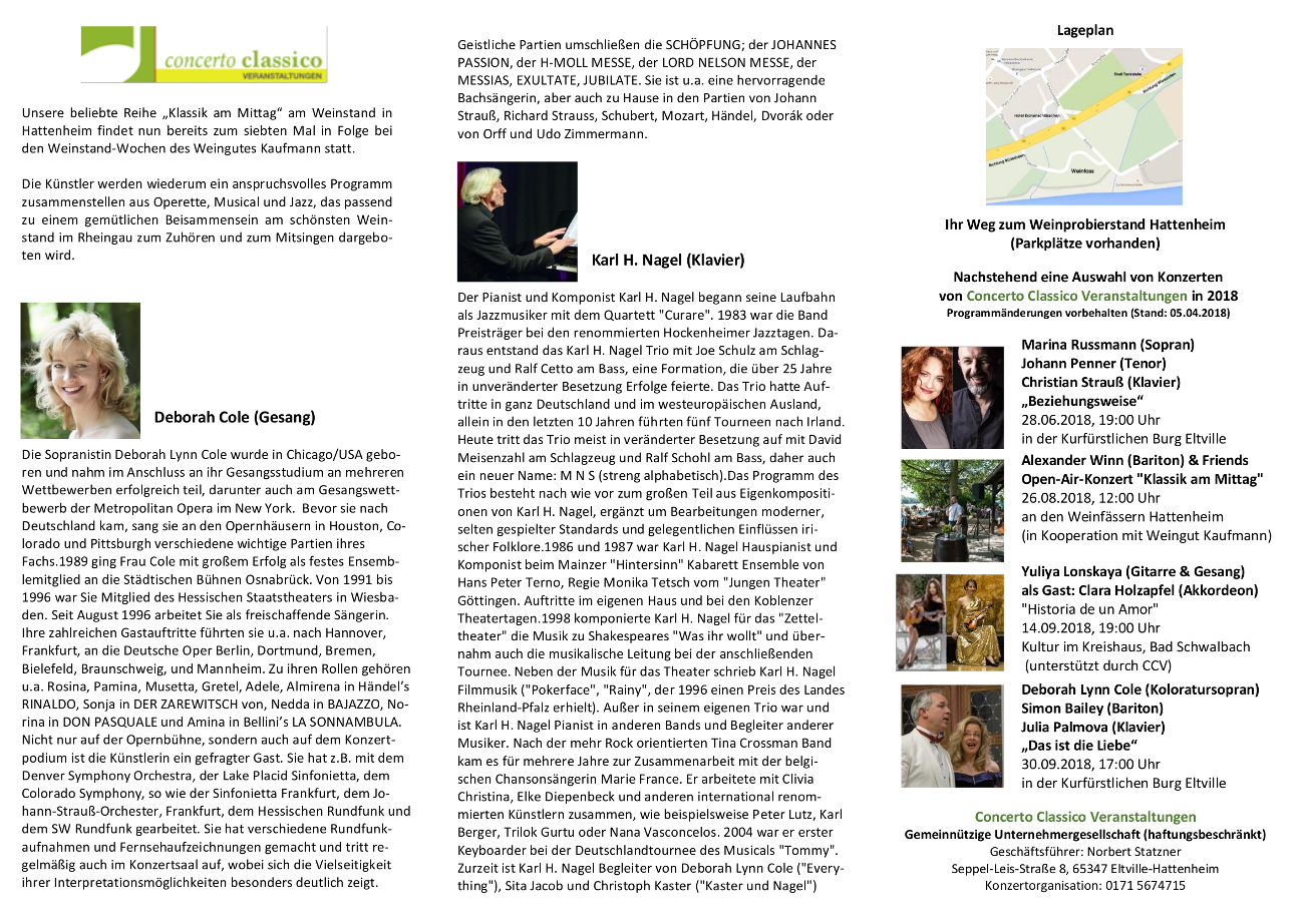 concerto classico Veranstaltungen gUG (haftungsbeschränkt) Norbert Statzner, Seppel-Leis-Straße 8, 65347 Eltville Tel.: (01 71) 5 67 47 15 E-Mail: kontakt@concertoclassico.de |