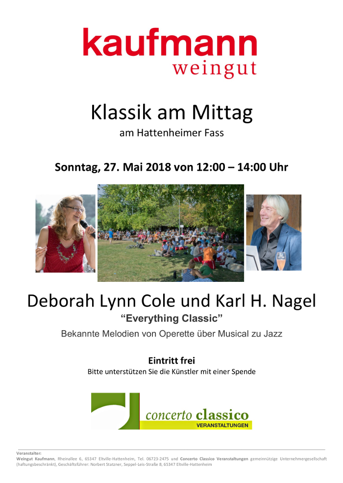 Die Künstler werden wiederum ein anspruchsvolles Programm zusammenstellen aus Operette, Musical und Jazz, das passend zu einem gemütlichen Beisammensein am schönsten Weinstand im Rheingau zum Zuhören und zum Mitsingen dargeboten wird.