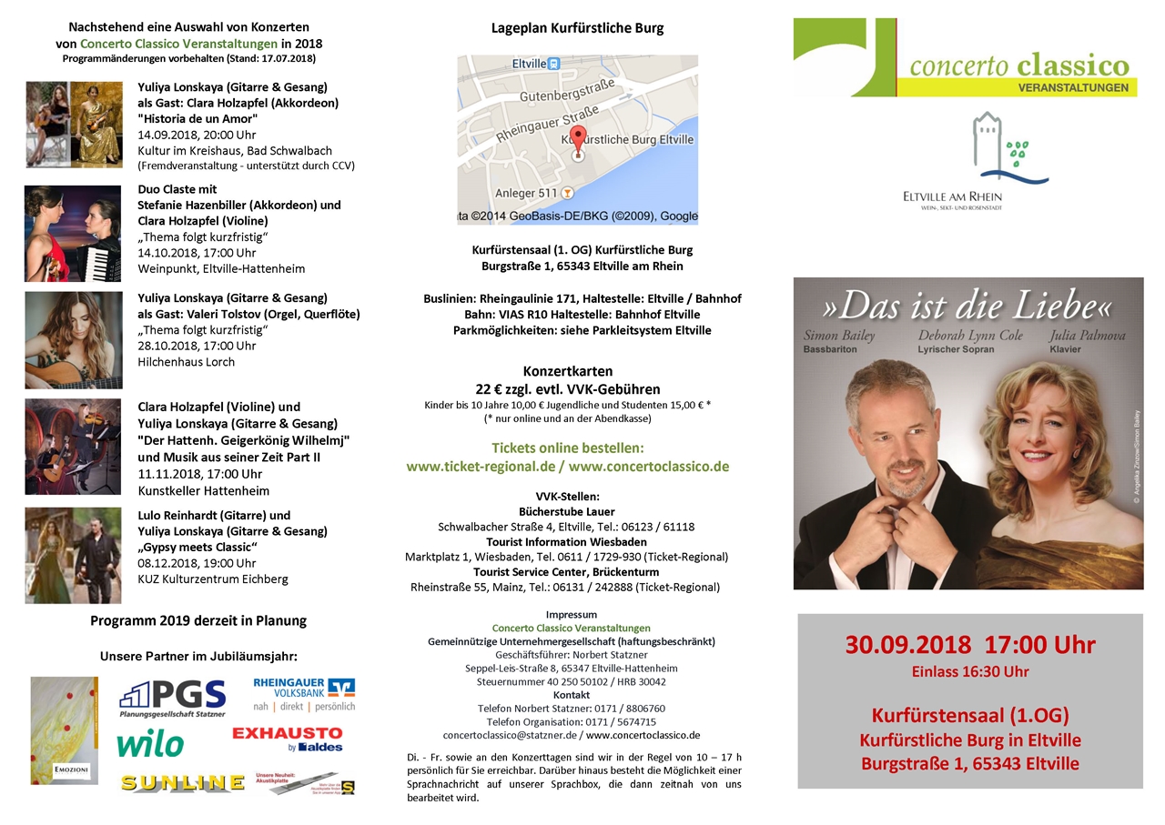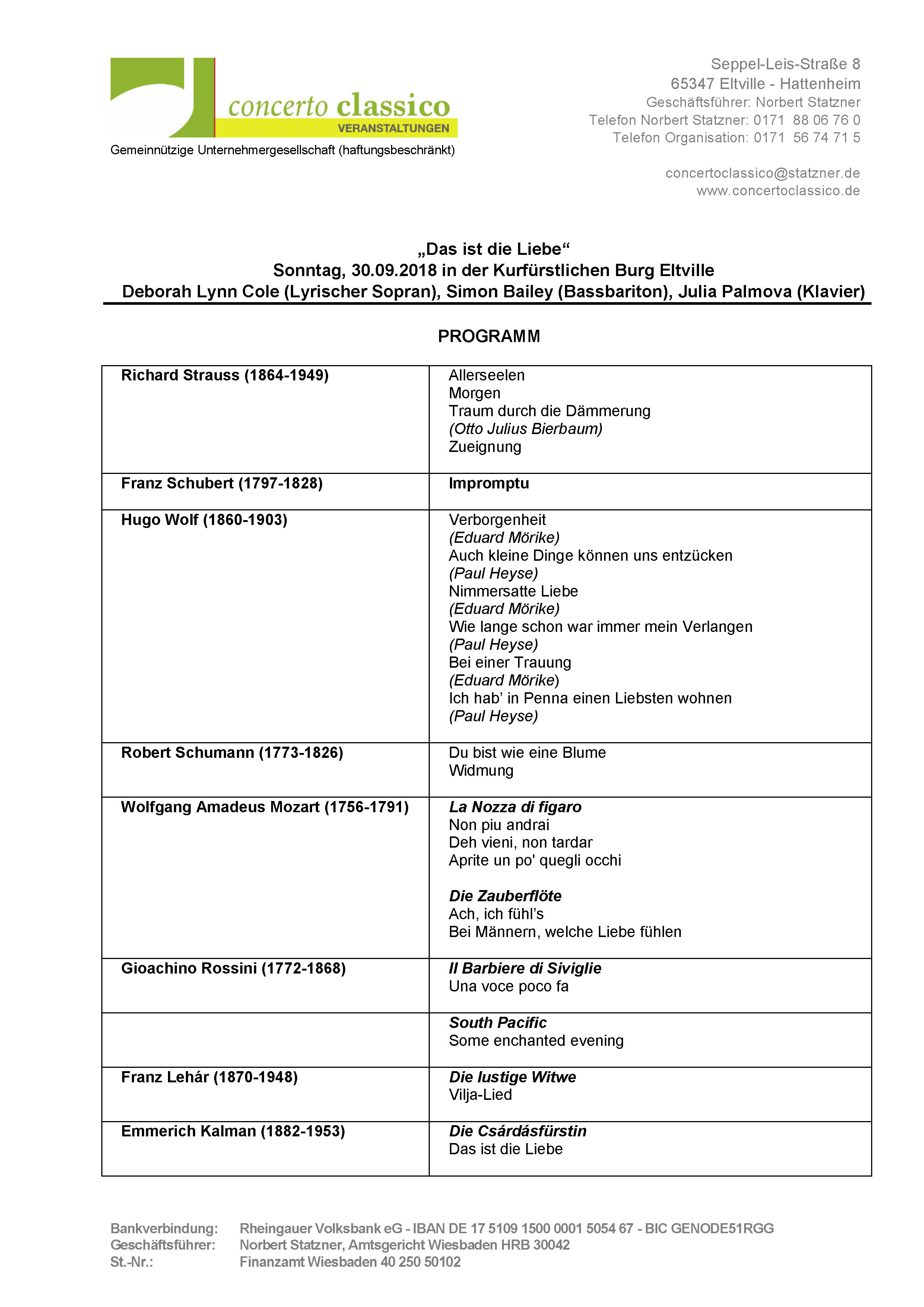 concerto classico Veranstaltungen gUG (haftungsbeschränkt) Norbert Statzner, Seppel-Leis-Straße 8, 65347 Eltville Tel.: (01 71) 5 67 47 15 / Fax: (0 67 23) 6 03 50 - 29 E-Mail: kontakt@concertoclassico.de |