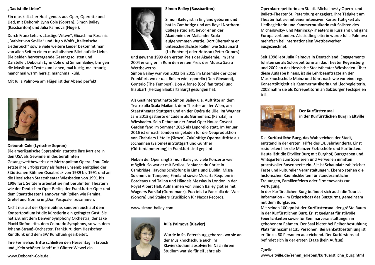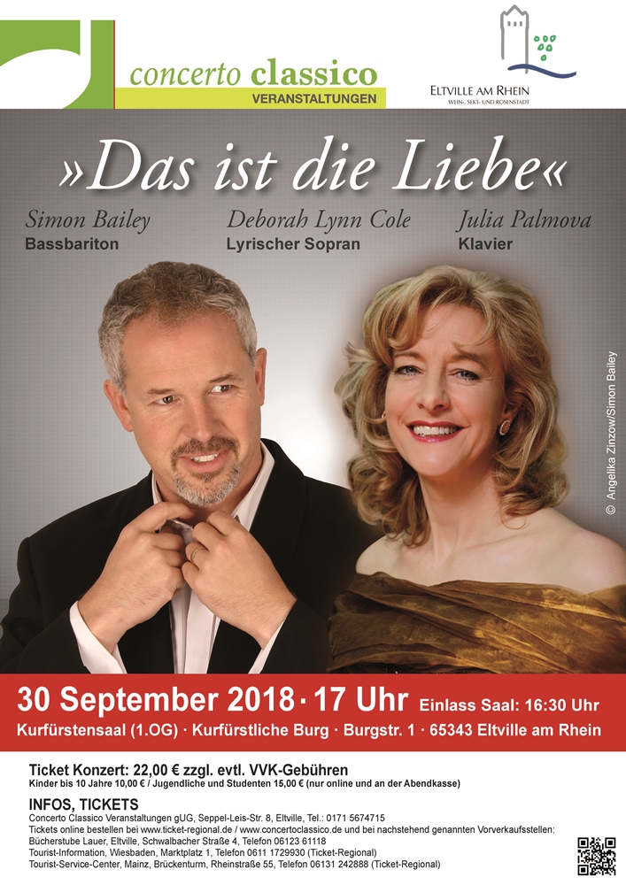 Ein musikalischer Hochgenuss aus Oper, Operette und Lied, mit Deborah Lynn Cole (Lyrischer Sopran), Simon Bailey (Bassbariton) und Julia Palmova (Flügel).