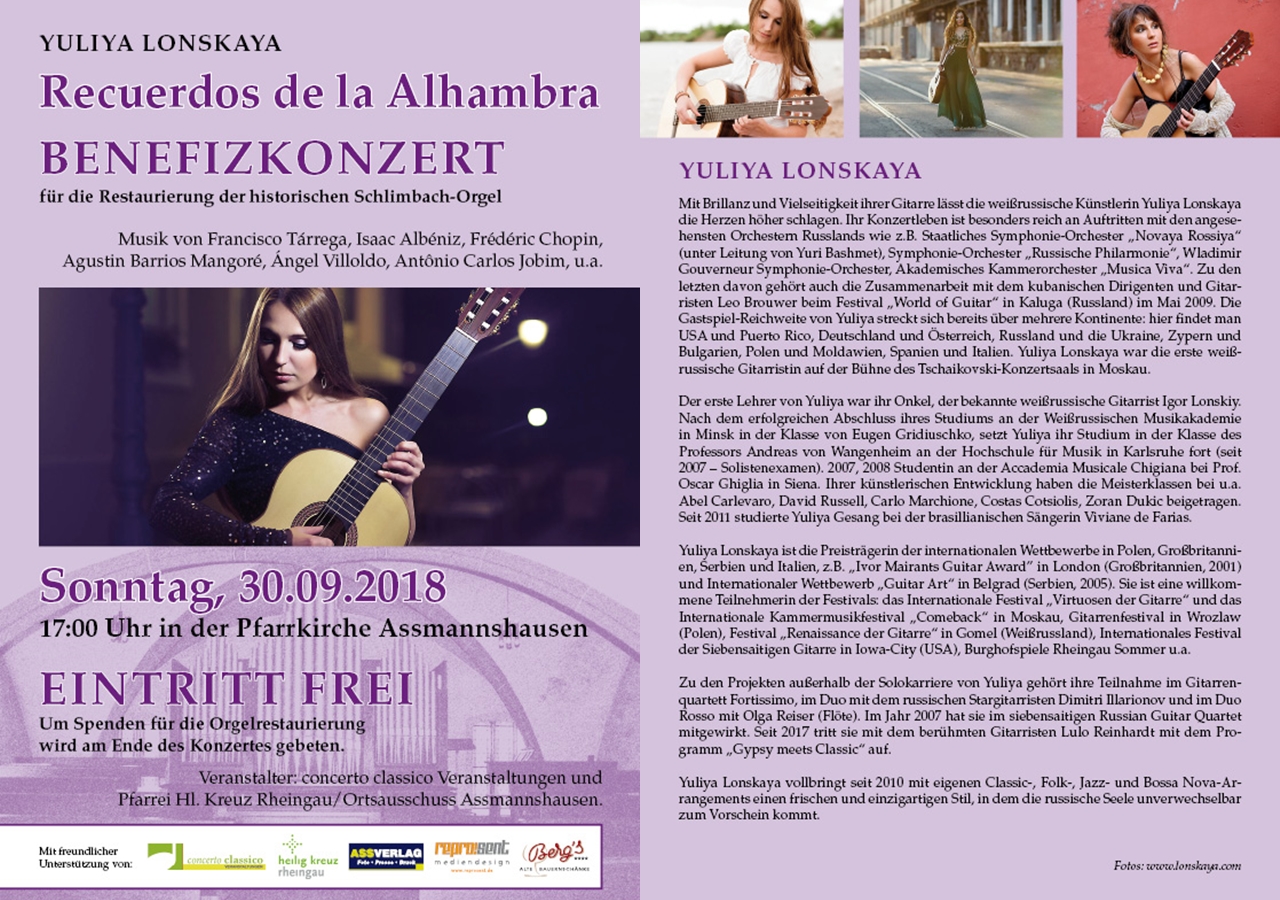Yuliya Lonskaya ist Preisträgerin mehrerer europäischer Gitarrenwettbewerbe und die erste Gitarristin aus Weißrussland, die im Tschaikowski-Konzertsaal der anspruchsvollen Moskauer Philharmonie spielte. Zu ihrem Repertoire zählen Interpretationen von Werken des Barock und der Romantik bis hin zur von Folk und Ethno geprägten Musik der Moderne. In ihrem Programm präsentiert sie authentisch eine Mischung von elegantem Walzer bis zur leidenschaftlichen spanischen Serenade, von dem sinnlichen argentinischen Tango bis zur feurigen brasilianischen Samba.