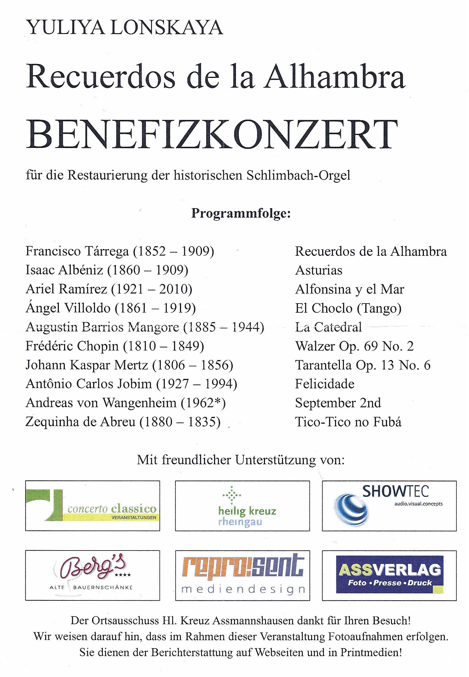 concerto classico Veranstaltungen gUG (haftungsbeschränkt) Norbert Statzner, Seppel-Leis-Straße 8, 65347 Eltville Tel.: (01 71) 5 67 47 15 / Fax: (0 67 23) 6 03 50 - 29 E-Mail: kontakt@concertoclassico.de |