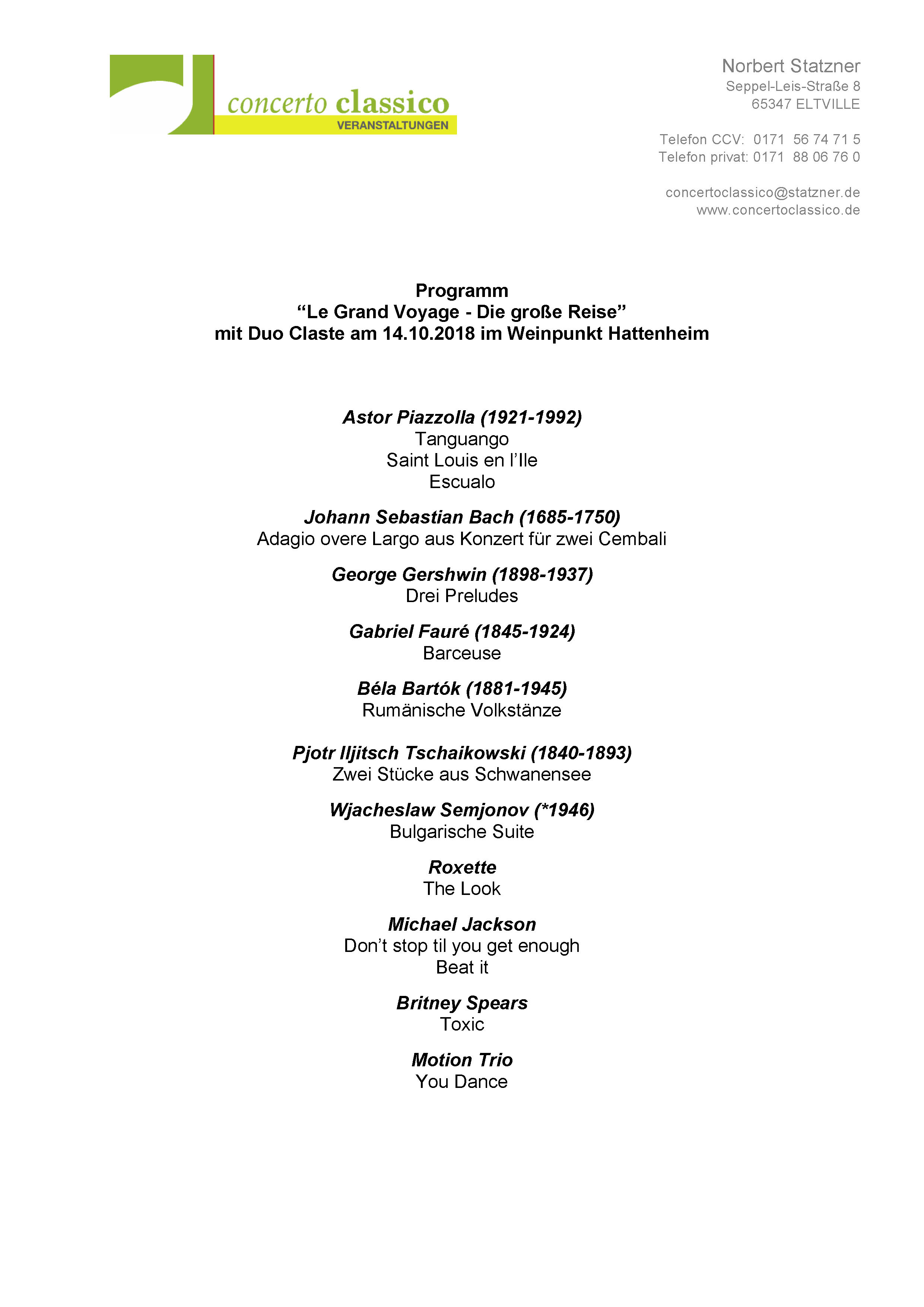 concerto classico Veranstaltungen gUG (haftungsbeschränkt) Norbert Statzner, Seppel-Leis-Straße 8, 65347 Eltville Tel.: (01 71) 5 67 47 15 / Fax: (0 67 23) 6 03 50 - 29 E-Mail: kontakt@concertoclassico.de |