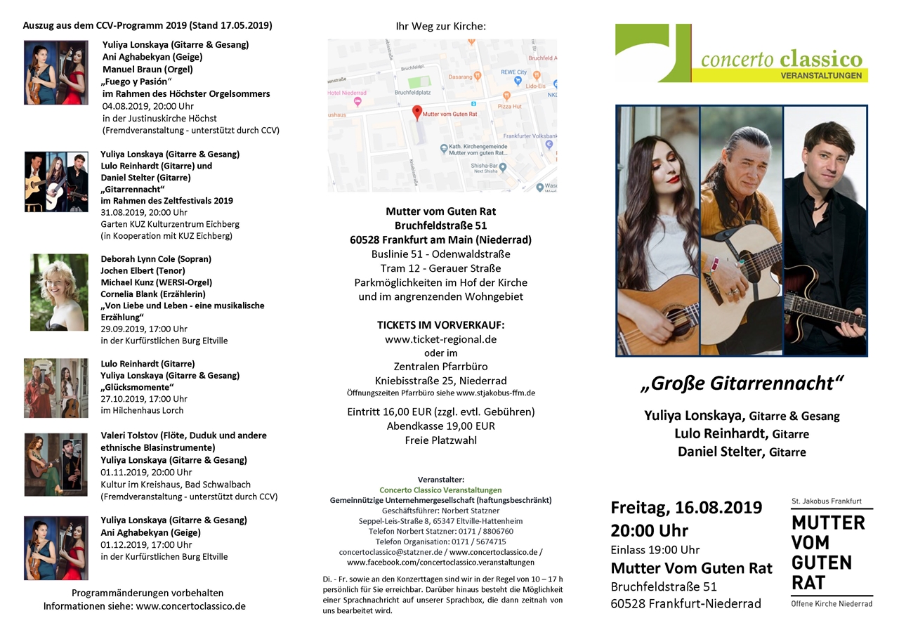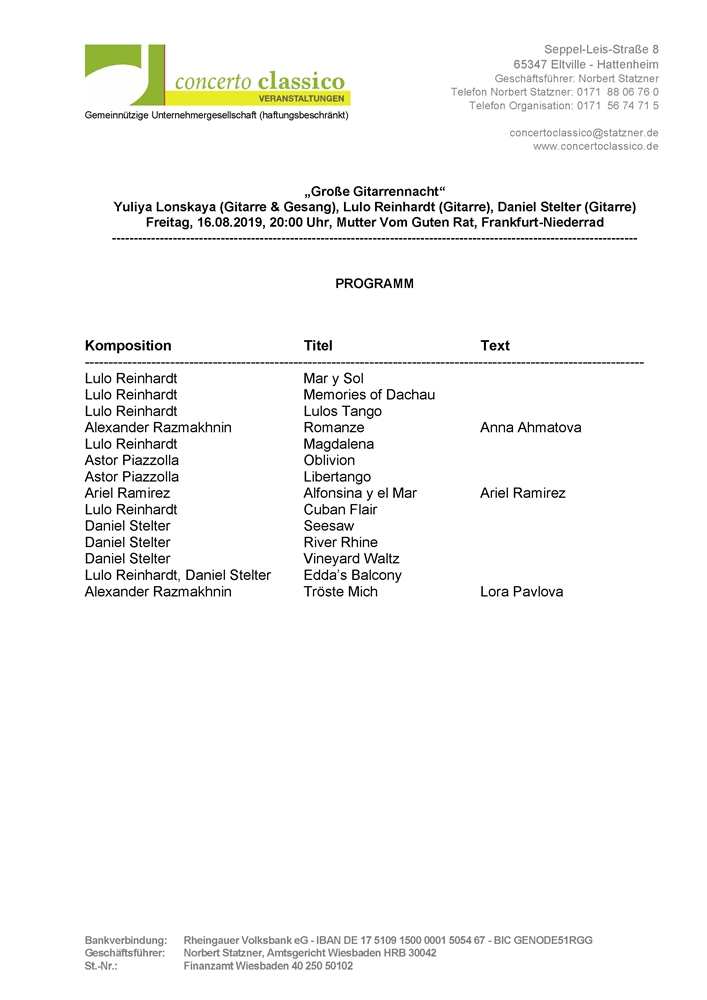 concerto classico Veranstaltungen gUG (haftungsbeschränkt) Norbert Statzner, Seppel-Leis-Straße 8, 65347 Eltville Tel.: (01 71) 5 67 47 15 / Fax: (0 67 23) 6 03 50 - 29 E-Mail: kontakt@concertoclassico.de |