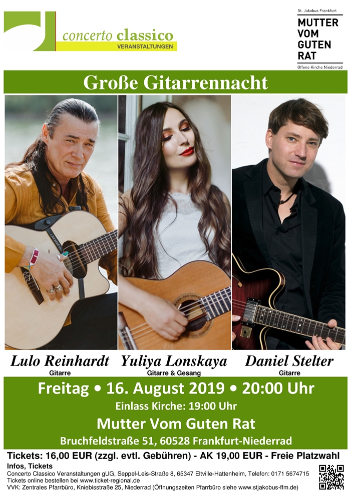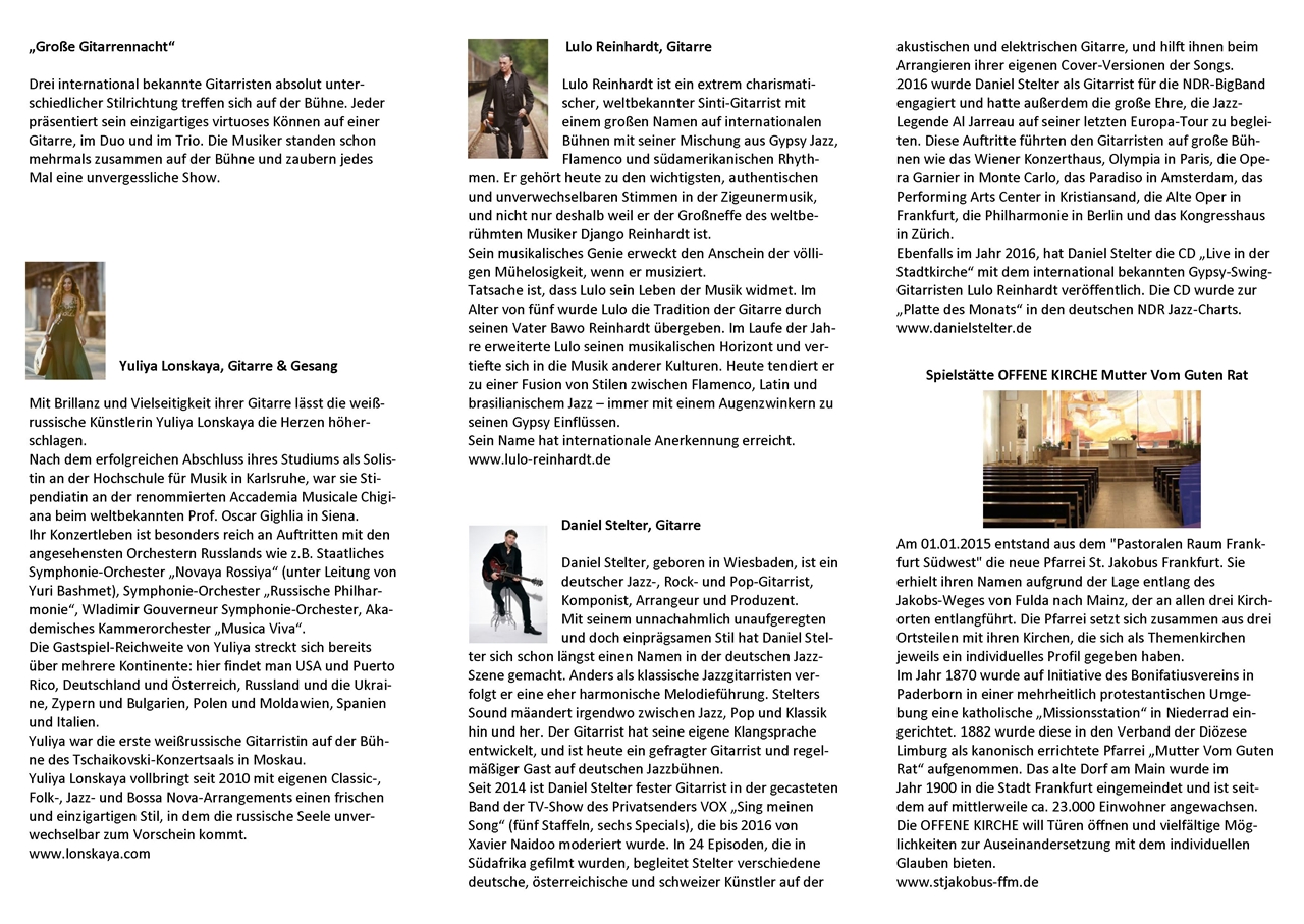 Drei international bekannte Gitarristen absolut unterschiedlicher Stilrichtung treffen sich auf der Bühne. Jeder präsentiert sein einzigartiges virtuoses Können auf einer Gitarre, im Duo und im Trio. Die Musiker standen schon mehrmals zusammen auf der Bühne und zaubern jedes Mal eine unvergessliche Show.