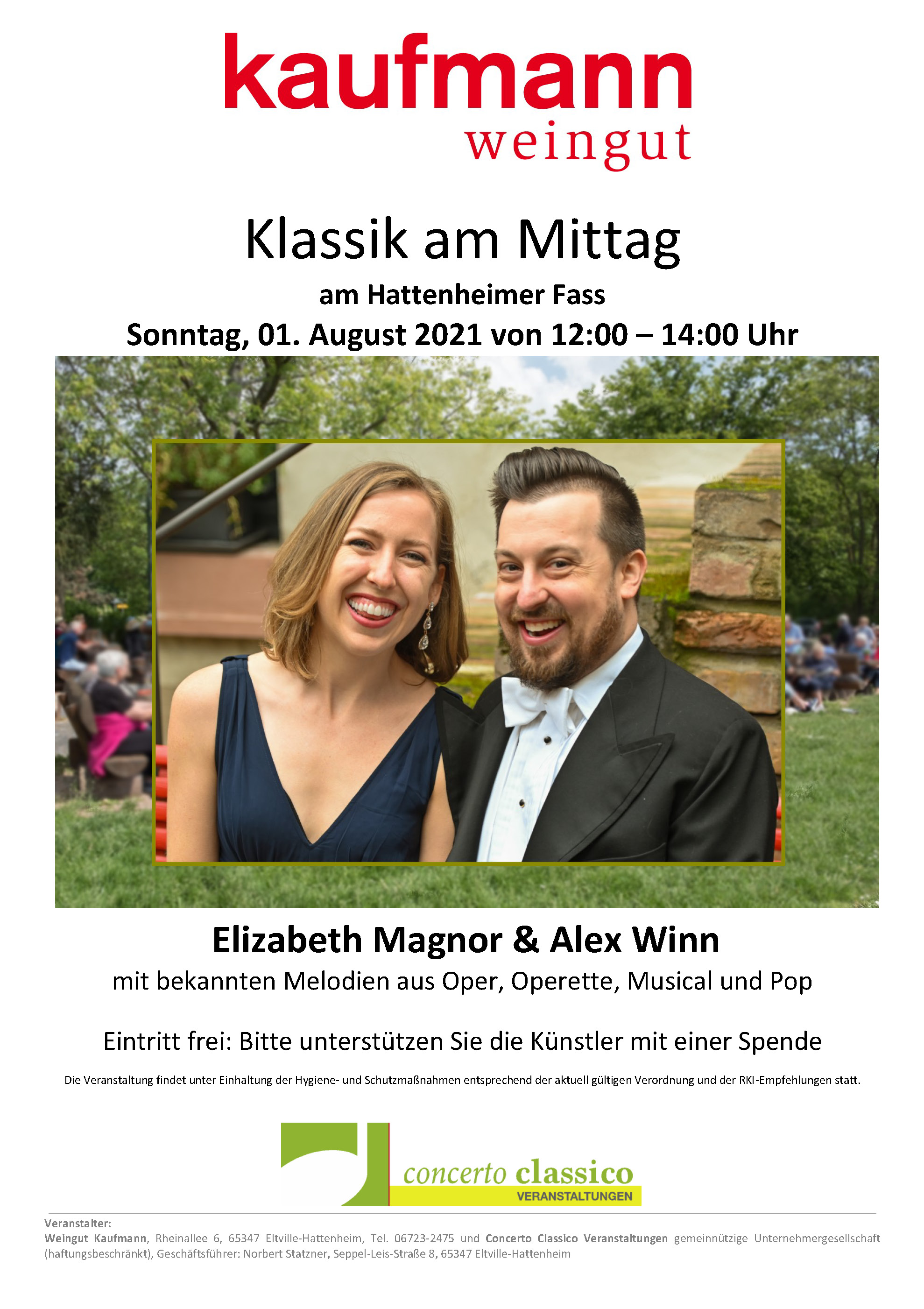 concerto classico Veranstaltungen gUG (haftungsbeschränkt) Norbert Statzner, Seppel-Leis-Straße 8, 65347 Eltville Tel.: (01 71) 5 67 47 15 / Fax: (0 67 23) 6 03 50 - 29 E-Mail: kontakt@concertoclassico.de |